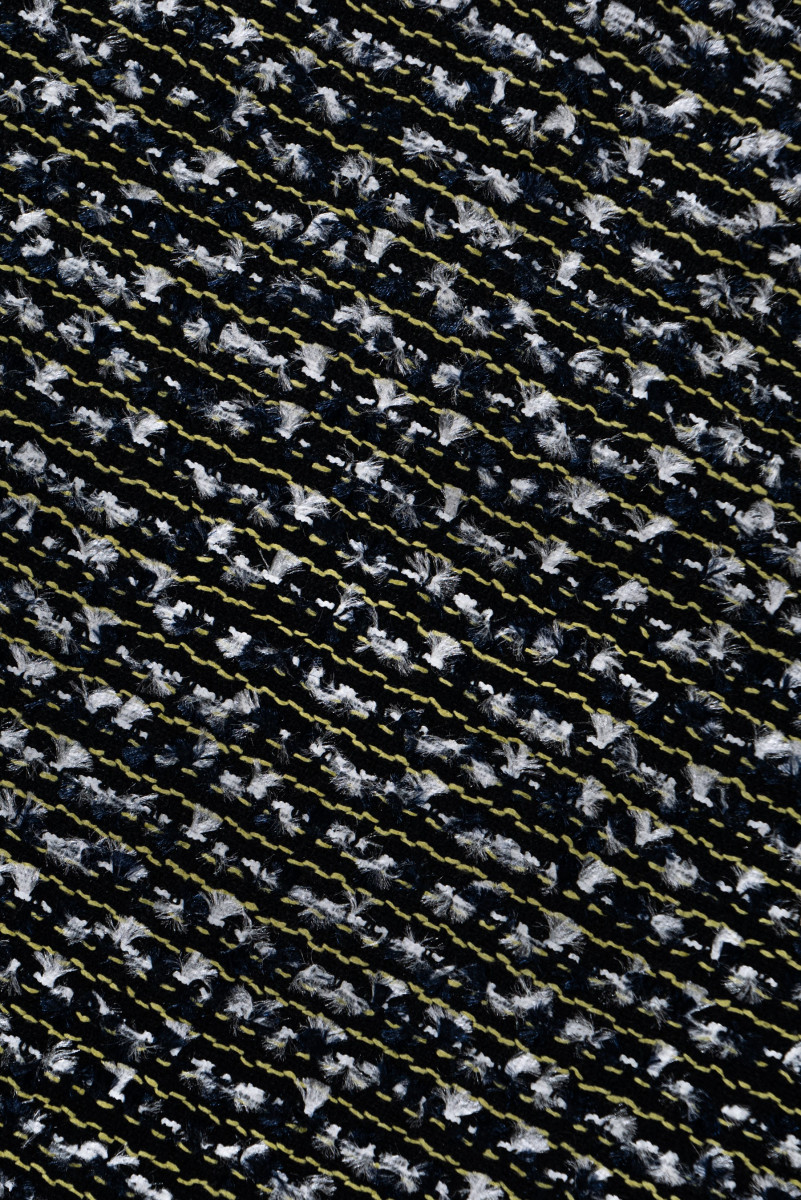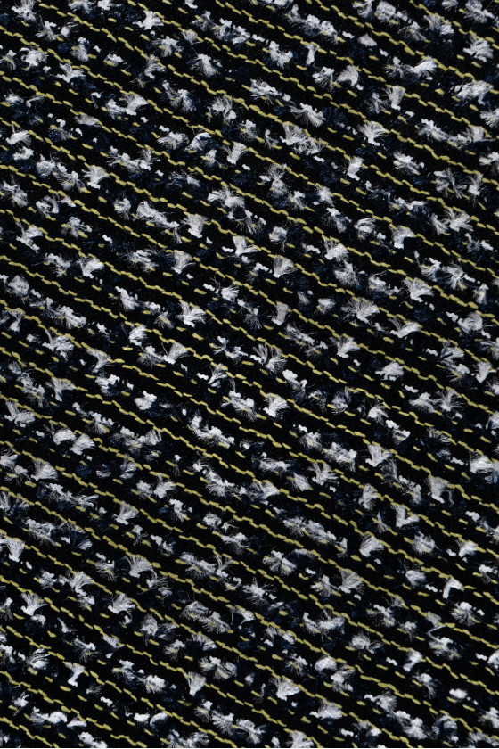 Італійська костюмна тканина Шанель чорного кольору з білим і темно-синім кольором, маленькими китицями і салатовою ниткою, розташована горизонтальними смугами. Тканина Шанель - дуже елегантна, м'яка і м'ясиста тканина, відома своїм оригінальним переплетенням.