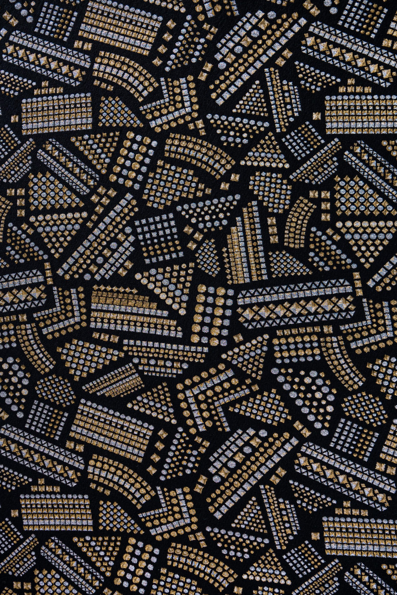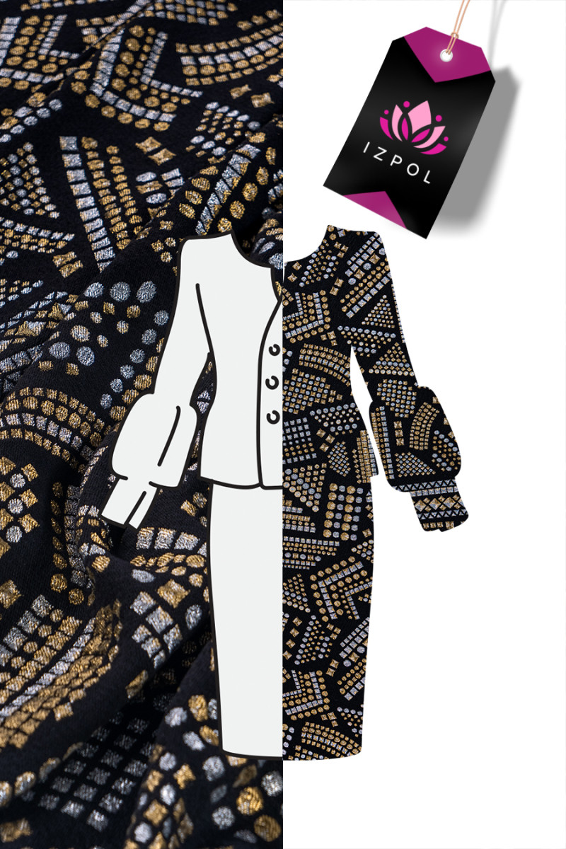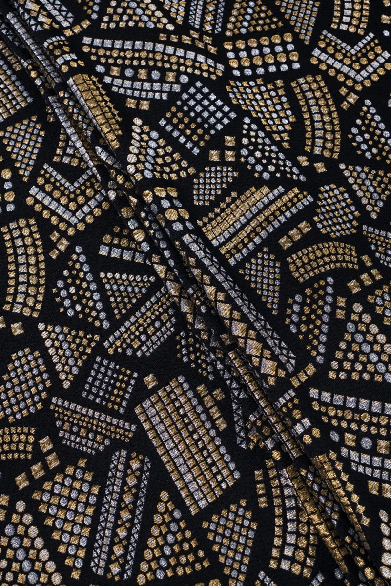 Італійська костюмна тканина Шанель чорного кольору з геометричними мотивами в сріблі і золоті. Більш щільна тканина з щільним переплетенням, нееластична.