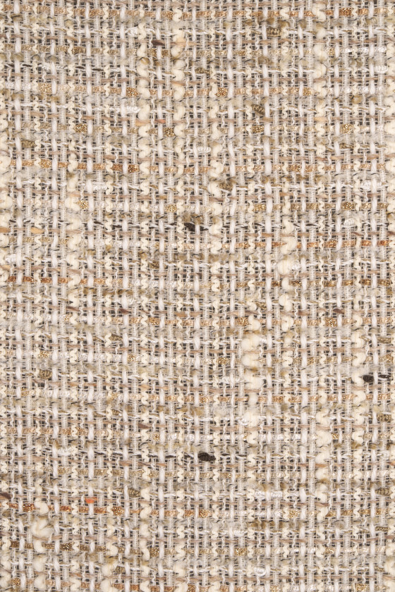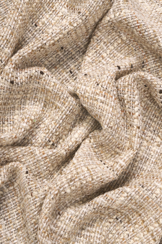 Італійська костюмна тканина Шанель різних відтінків бежевого кольору з золотою ниткою. Тканина Шанель - дуже елегантна, м'яка і м'ясиста тканина, відома своїм оригінальним переплетенням. Відмінно підійде для пошиття костюма, жакета, жакета, спідниці або тонкого пальто.