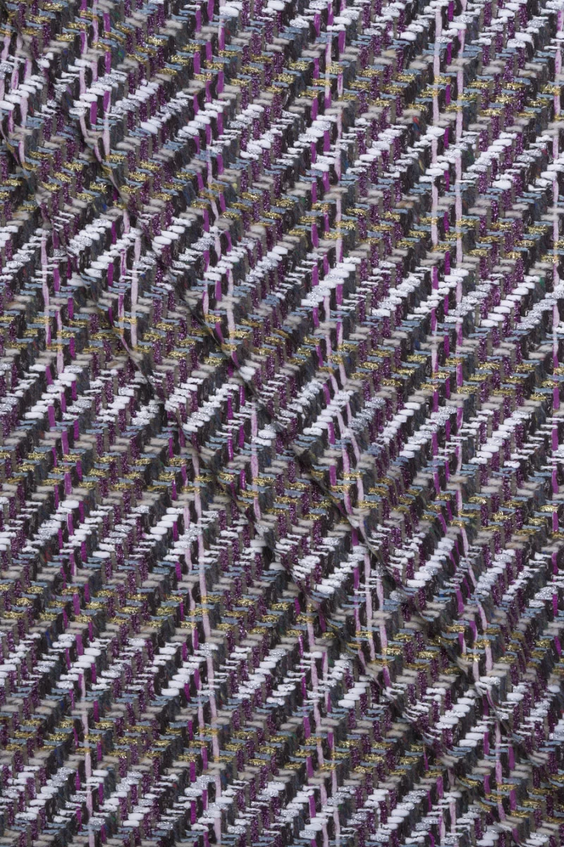 Італійська костюмна тканина Шанель сірого, екрю та фіолетового кольору. Тканина зі злегка опуклою структурою та більш вільним, химерним переплетенням, що створює картатий мотив. Тканина делікатно прикрашена блискучою ниткою, що додає їй елегантності. Тканина виготовляється переважно з натуральних волокон, тому дуже зручна в носінні, а додавання синтетичної нитки робить її більш міцною і не мнеться. Фантастична пропозиція для шанувальників твідового одягу в наймодніших кольорах.