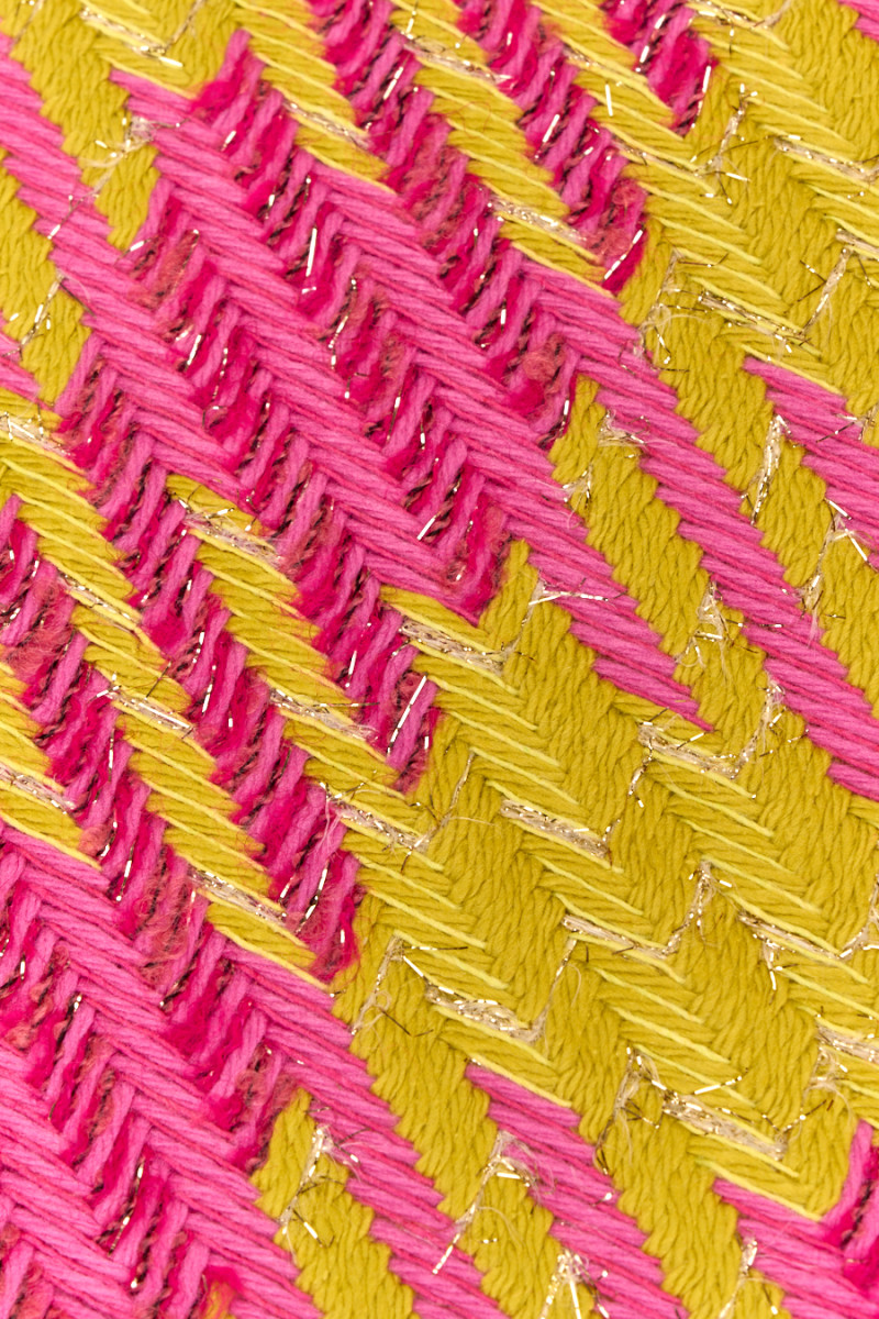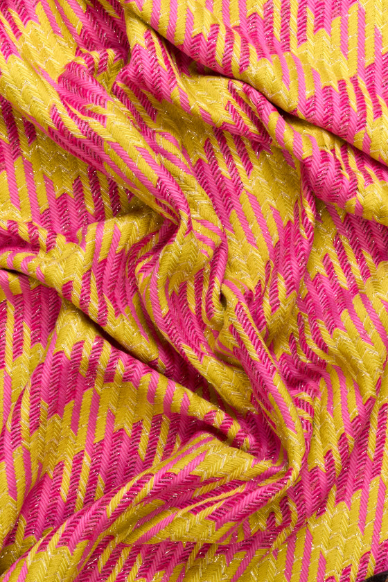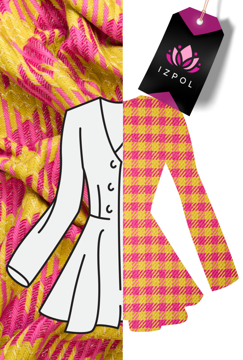 Італійська костюмна тканина Шанель в салатовому і рожевому кольорах з щільним переплетенням, прикрашена золотою люрексовою ниткою. Тканина виготовляється переважно з натуральних волокон, тому дуже зручна в носінні, м'яка, а додавання синтетичної нитки робить її більш міцною і не мнеться. Прекрасна пропозиція для людей, які люблять енергійні кольори.