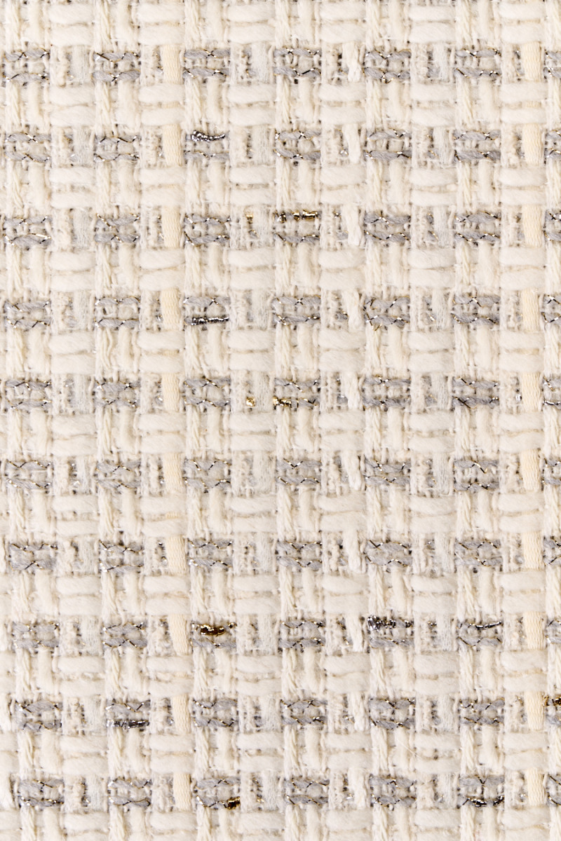 Італійська костюмна тканина Шанель в кольорі екрю з сірим, горизонтальним переплетенням прикрашена золотистими, блискучими нитками, що додає їй елегантності. Тканина в основному виготовляється з натуральних волокон, тому дуже зручна в носінні, м'яка і не еластична. Фантастична пропозиція для шанувальників твідового одягу в світлих пастельних тонах.