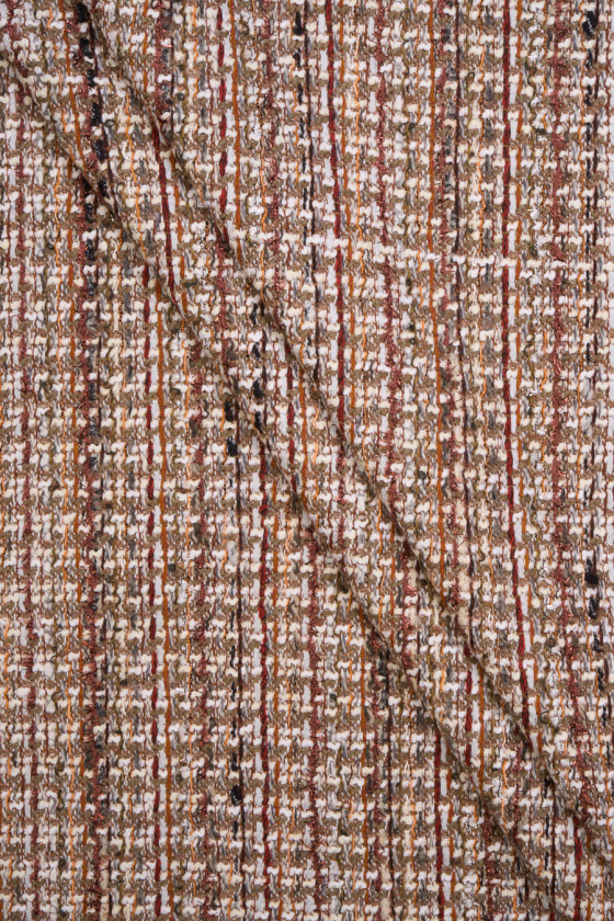 Італійська костюмна тканина Шанель коричневого, кремового і землисто-бежевого кольорів, додатково збагачена блискучими нитками. Тканина м'яка, середньої товщини, виготовляється переважно з натуральних волокон, тому дуже зручна в носінні, відома своїм оригінальним плетінням. Він відмінно підійде для пошиття костюма, сукні і тонкого пальто.