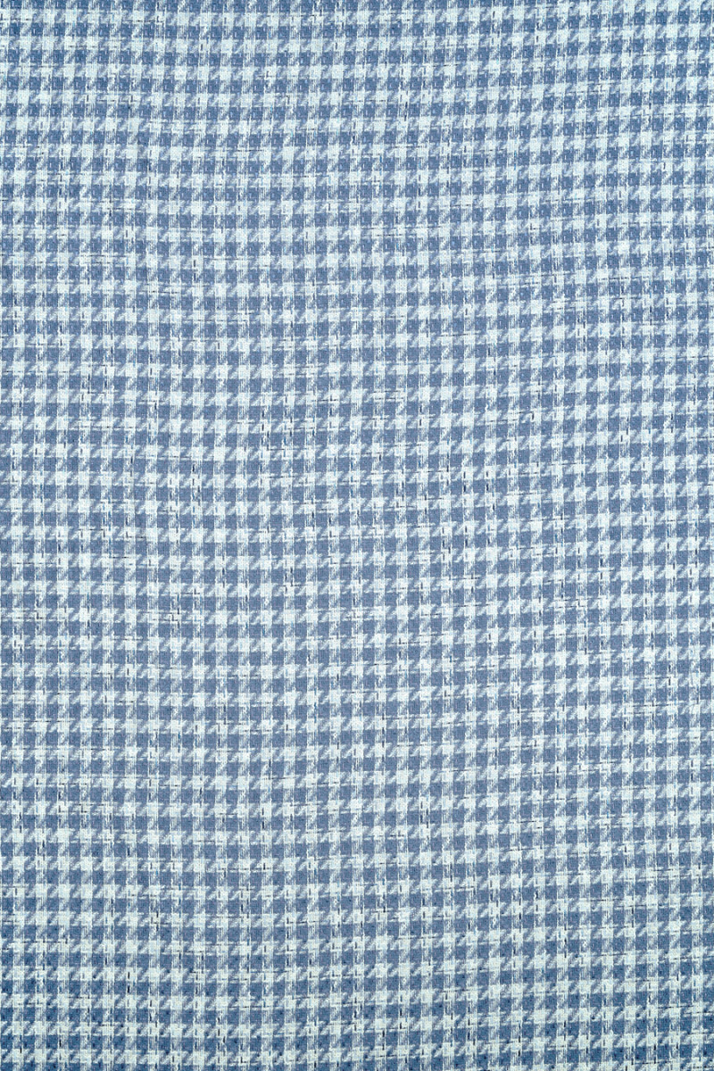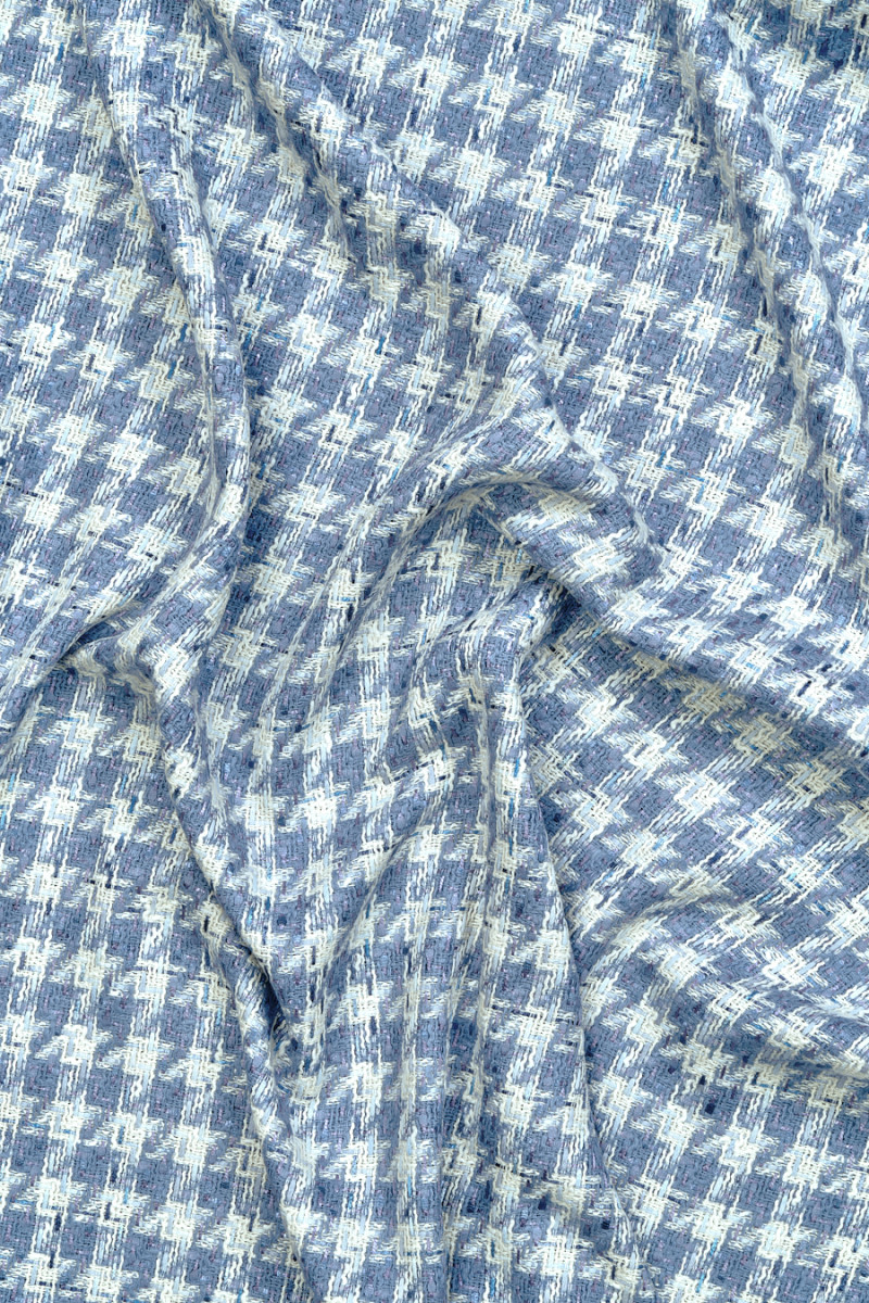 Італійська костюмна тканина Шанель світло-блакитного кольору і екрю, прикрашена мерехтливою блакитною ниткою. Тканина м'яка, приємна на дотик, виготовляється переважно з натуральних волокон, тому дуже зручна в носінні, відома своїм оригінальним плетінням. Він відмінно підійде для пошиття костюма, сукні і тонкого пальто.