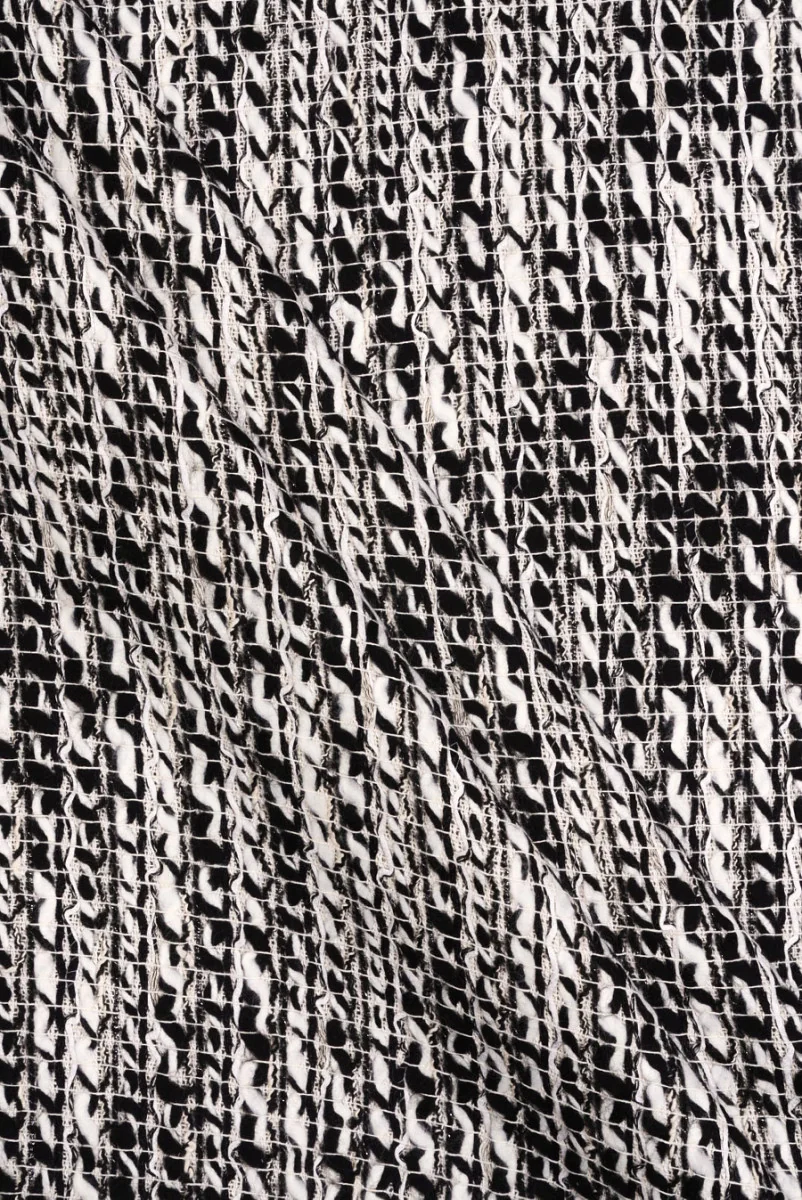 Італійська костюмна тканина Шанель білого і чорного кольорів з вплетеною в неї сріблястою блискучою ниткою. Білі і чорні нитки переплітаються один з одним, створюючи ніжний візерунок з смуг. Тканина м'яка, легка, не еластична і має пухке переплетення, вимагає підкладки. Позачасова пропозиція, яка ідеально підійде для пошиття костюма, піджака чи сукні.