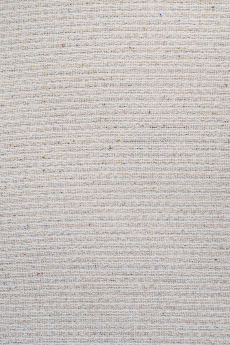 Платтяна тканина з вільним переплетенням як сітка, призначена для весняних суконь в кольорах кремового, дуже світло-бежевого кольору з ніжними, барвистими акцентами. Тканина виткана з віскози та поліаміду, і потребує підкладки.