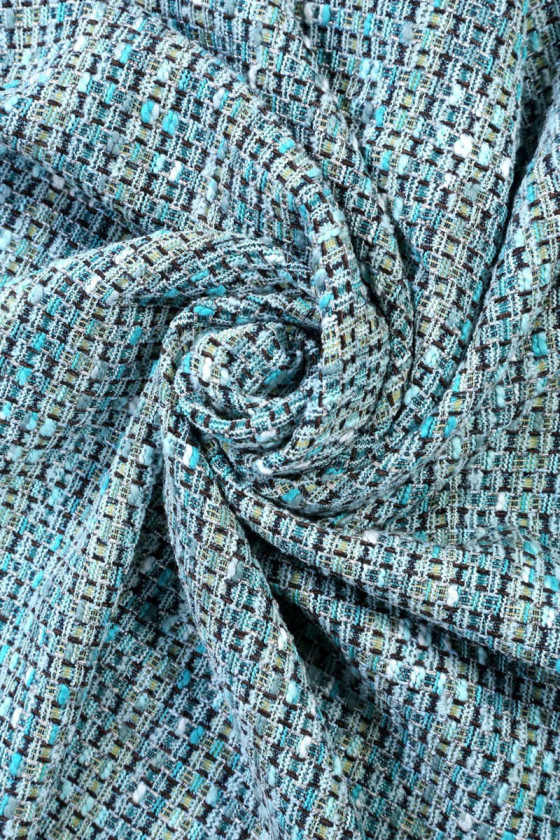 Красива, класична костюмна тканина Шанель в кольорах морсько-бірюзовий, синій з додаванням коричневого і білого. Ідеально підходить для таких комплектів, як: жакет + спідниця або сукні.