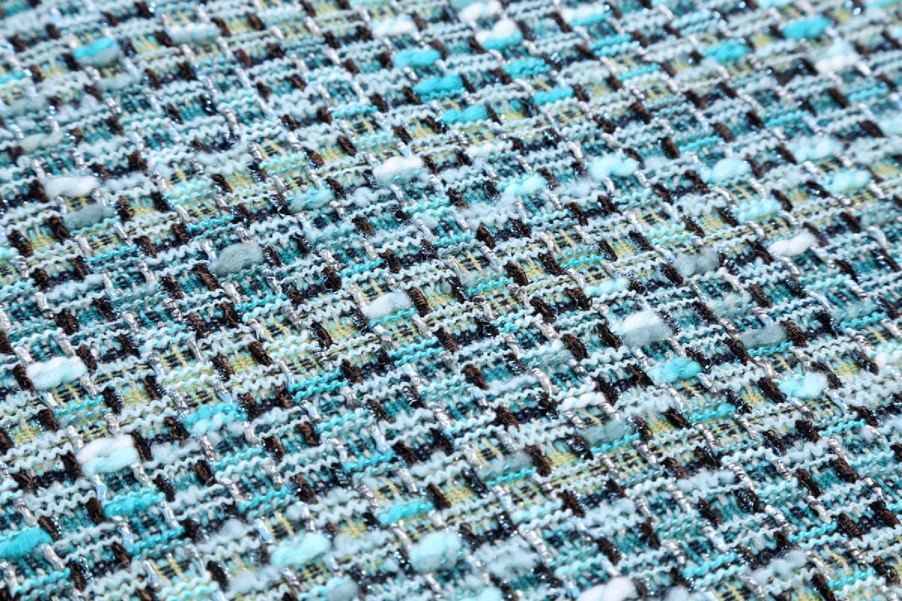 Красива, класична костюмна тканина Шанель в кольорах морсько-бірюзовий, синій з додаванням коричневого і білого. Ідеально підходить для таких комплектів, як: жакет + спідниця або сукні. Натуральні нитки, такі як шерсть, бавовна і віскоза, забезпечують комфорт. Він вимагає використання підкладки, яку можна вибрати в нашому магазині.
