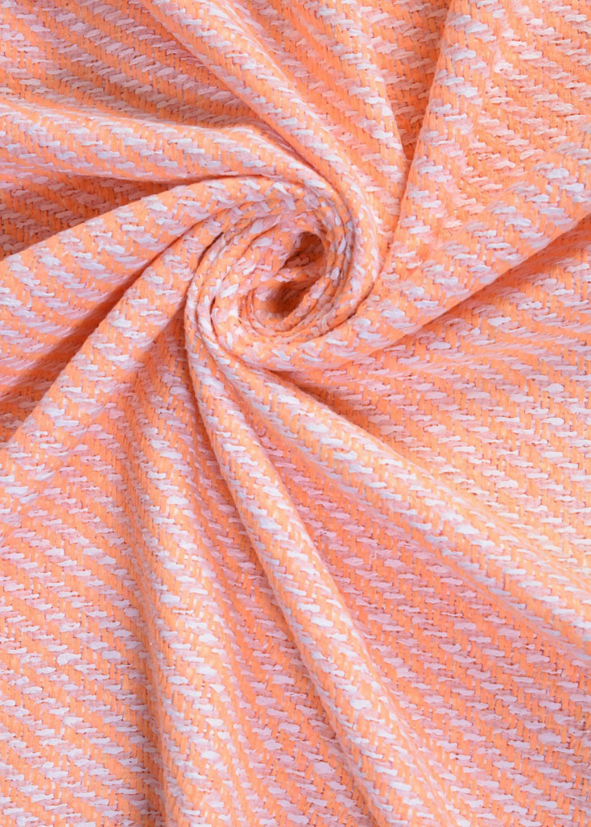 Красива, класична костюмна тканина Шанель весняного жовтого і білого кольору, вся річ прошита темно-помаранчевою ниткою, яку майже не видно. Тканина м'яка, нееластична, досить тонка, вимагає використання підкладки, яку можна вибрати в нашому магазині. Він відмінно підійде для таких комплектів як: жакет + спідниця, а також суконь.