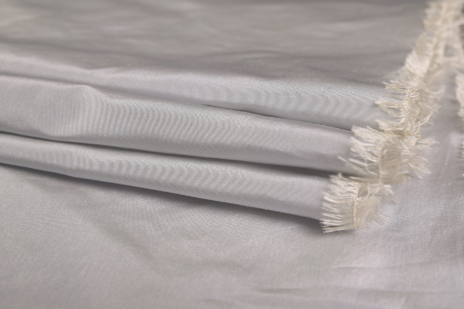 Двоколірна шовкова тафта (світло-бежева і сіра нитка) світло-сіро-блакитного кольору - гладка, блискуча і злегка жорстка тканина. Ідеально підходить для елегантних офіційних нарядів - суконь, спідниць і тонких пальто. Також це може бути основа для мережива або більш тонких шовків. . Також він підходить в якості тканини для внутрішньої обробки - для штор, подушок і т.д