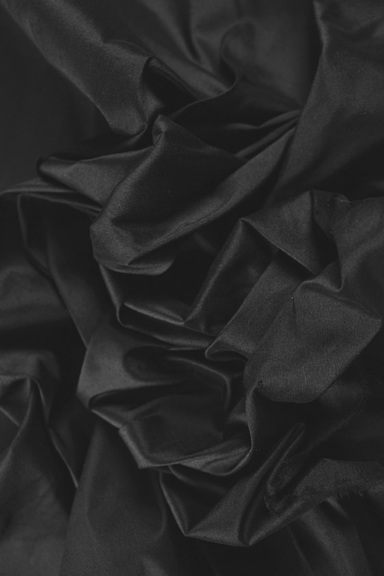 Чорна шовкова тафта шантун - це гладка, блискуча і злегка жорстка тканина. Ідеально підходить для елегантних офіційних нарядів - суконь, спідниць і тонких пальто. Тільки хімчистка!