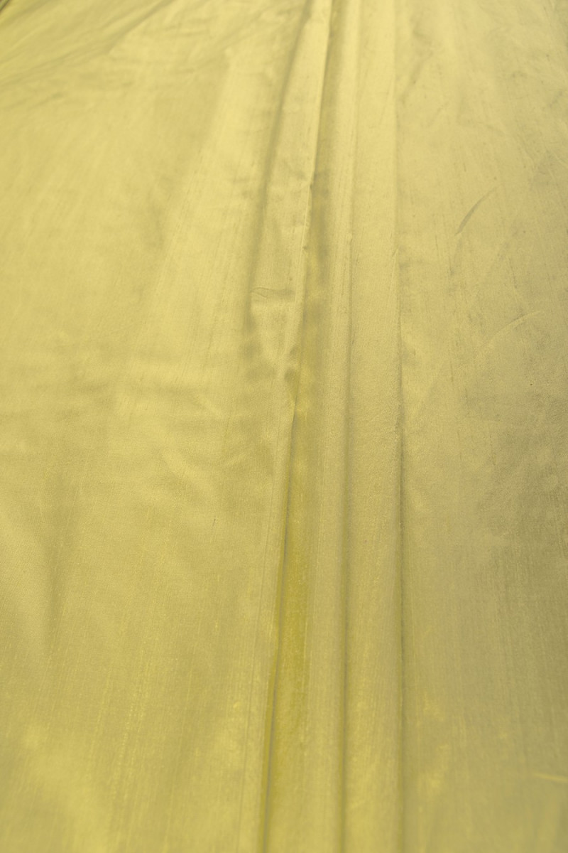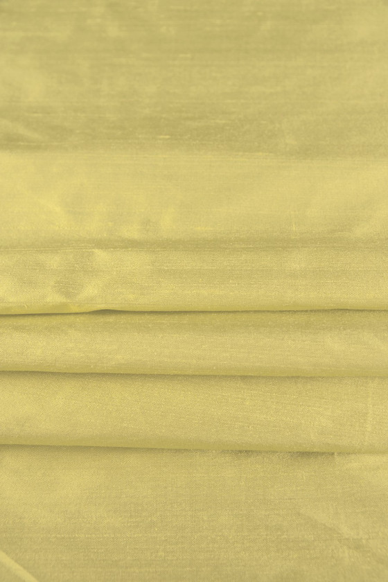 Шовк Шантунг з гладкою структурою, що нагадує тафту в зеленому лаймовому кольорі, являє собою нещільно ткане полотно, пофарбоване природним шляхом. Має злегка жорстку, пластичну структуру. Він підходить як для одягу, так і для прикраси інтер'єру - штор, подушок і т.д. Тільки хімчистка!