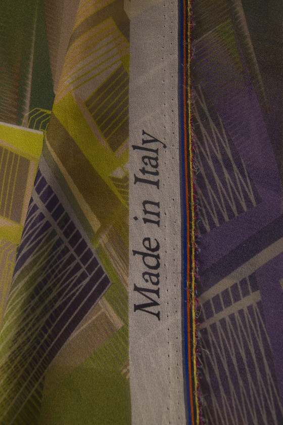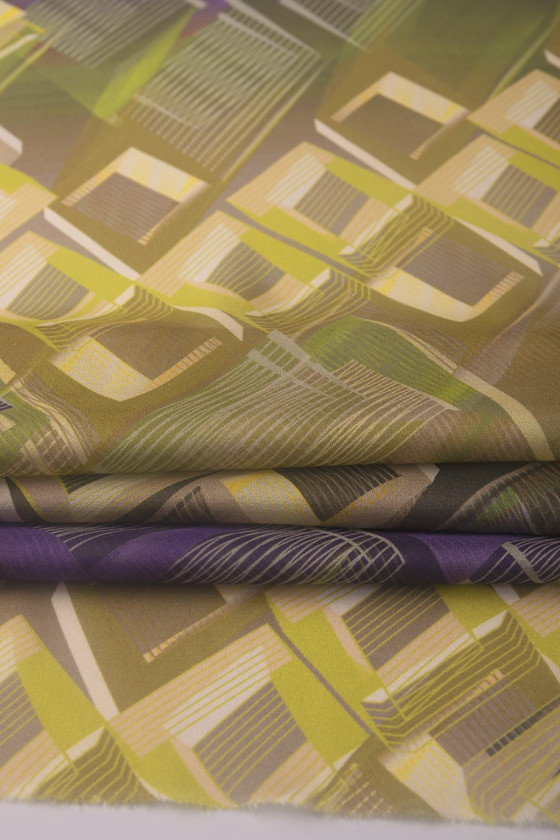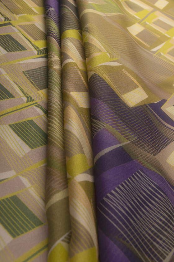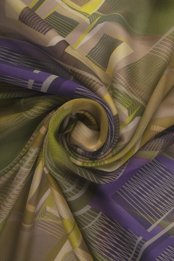 Шовкова жоржетта з геометричним візерунком в зеленому, бежевому і фіолетовому кольорах. Прозора тканина (потрібна підкладка). Ніжна, ідеальна для літньої спеки, 100% натуральна тканина, дуже повітряна.