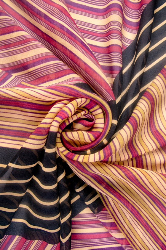 Шовкова жоржетка в неправильних модулях з кольоровими смугами (червона, чорна і жовта) Це злегка еластична, матова, дуже ніжна, напівпрозора тканина (вимагає підкладки