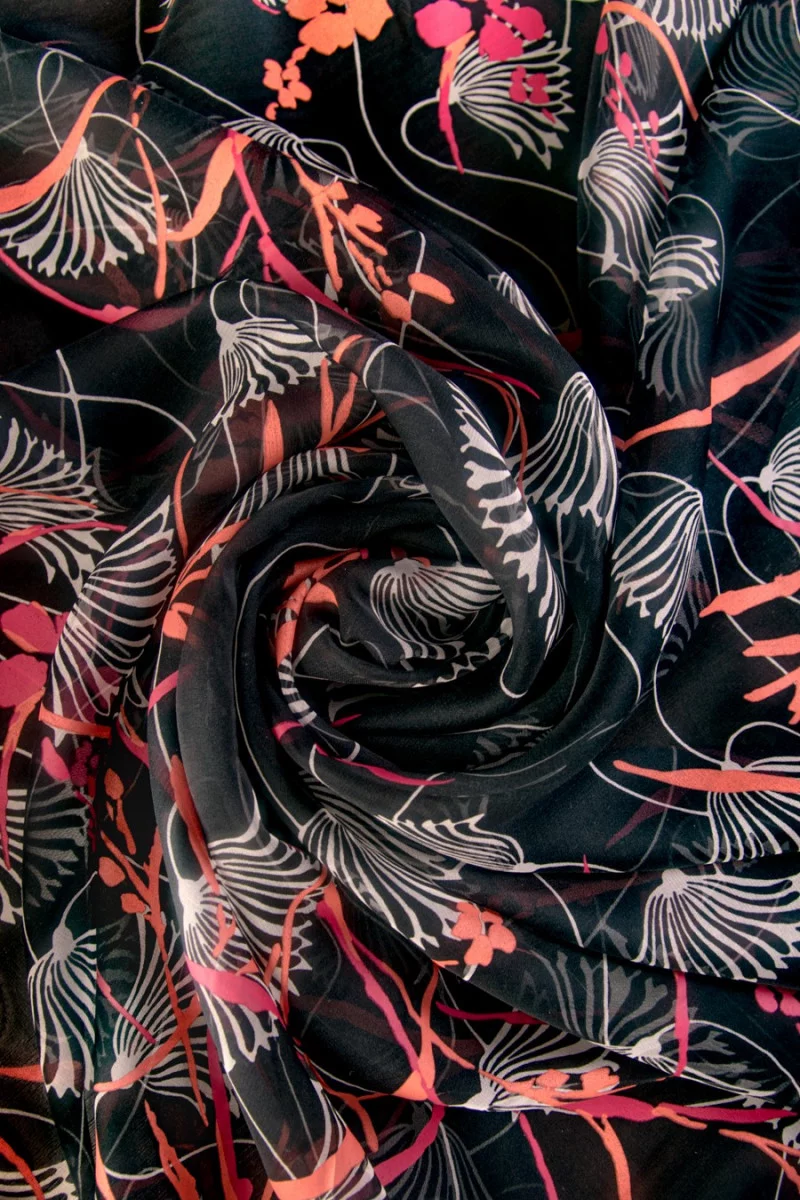 Муслін з натурального шовку чорного кольору. Візерунок з дрібними квіточками в кольорах, кремовому, кораловому, кольору фуксії. Муслін - дуже ніжна, повітряна, прозора тканина (вимагає підкладки).