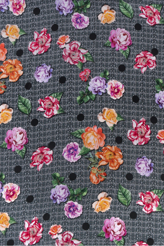 Жакардовий шовк, підписаний відомими модельєрами, з великими барвистими квітами на біло-чорному тлі. Розмір квіток близько 10 см. Тканина 100% натуральна, непрозора, з дуже ніжним блиском, красиво сидить. Рекомендуємо шити з нього елегантні блузи, сукні, спідниці, туніки