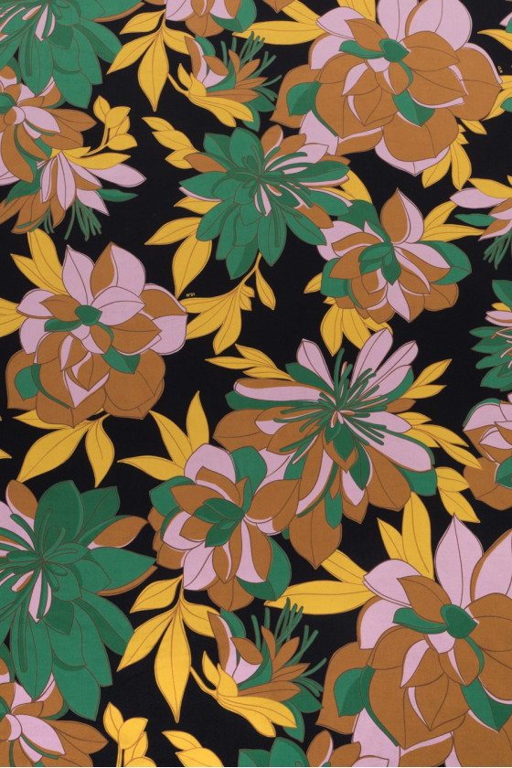 100% шовковий креп No 21 з великими квітками наступних кольорів: рожевий, зелений, коричний і жовтий на чорному тлі. Шовковий креп - ніжна, тонка, але непрозора, напівматова тканина. З його допомогою можна чаклувати над повітряними сукнями, ніжними блузами, шарфами, хустками.