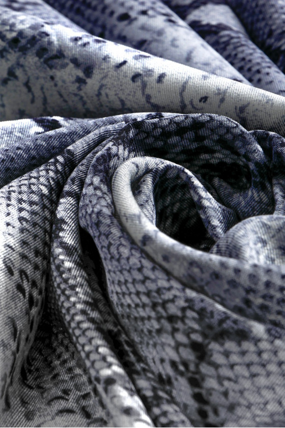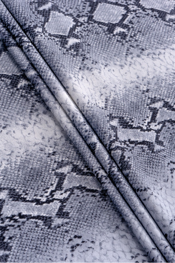 Більш щільний шовк з сірим зміїним малюнком, важка, струмлива, матова тканина. Рекомендуємо для суконь, брюк, спідниць.