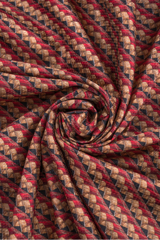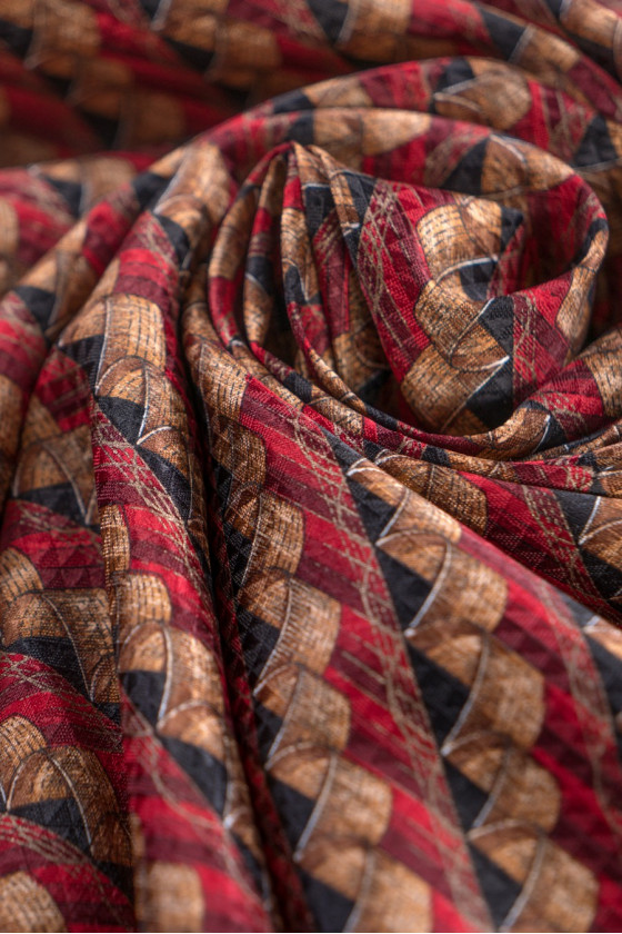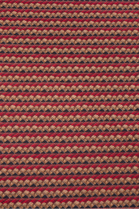 100% жакардовий шовк чорного, червоного та золотого кольорів з щільним тонким візерунком, розташованим у смужку. Тканина з щільним плетінням, ніжним блиском і більш жорсткою структурою. Ідеально підійде під шарф, краватку, блузку або чоловічий жилет. Також це може бути декоративна тканина.