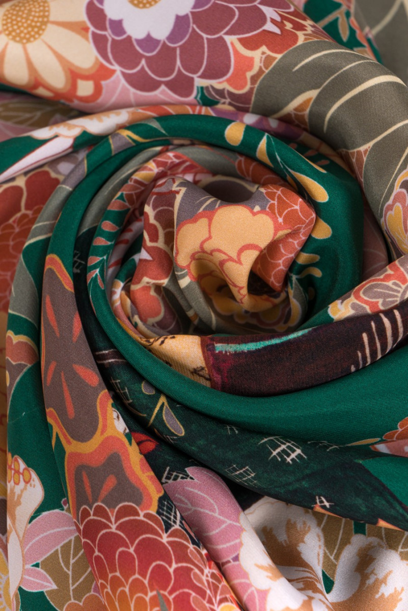 Італійська тканина 100% шовк зі східним мотивом пастельних квітів, птахів і прихованих фігур на зеленому тлі. Друк на матовій стороні.