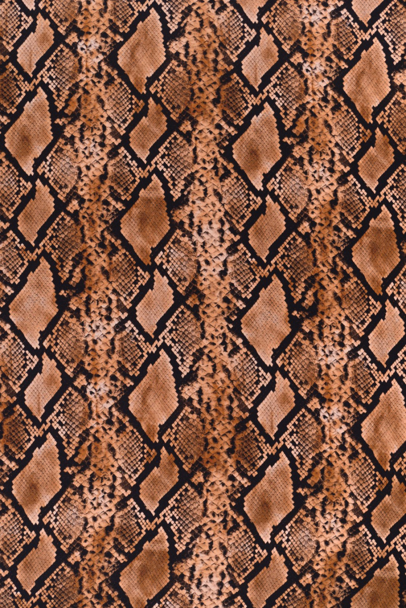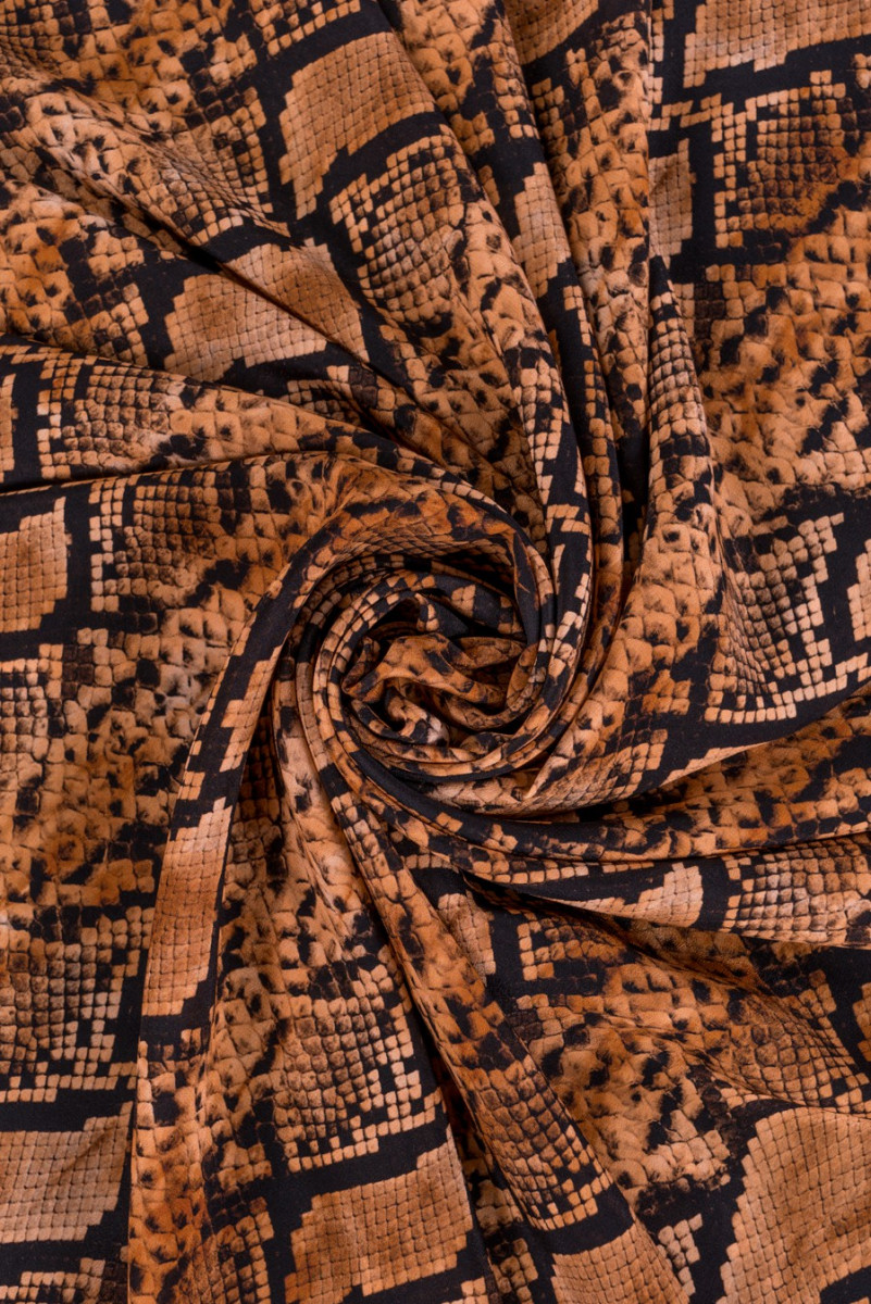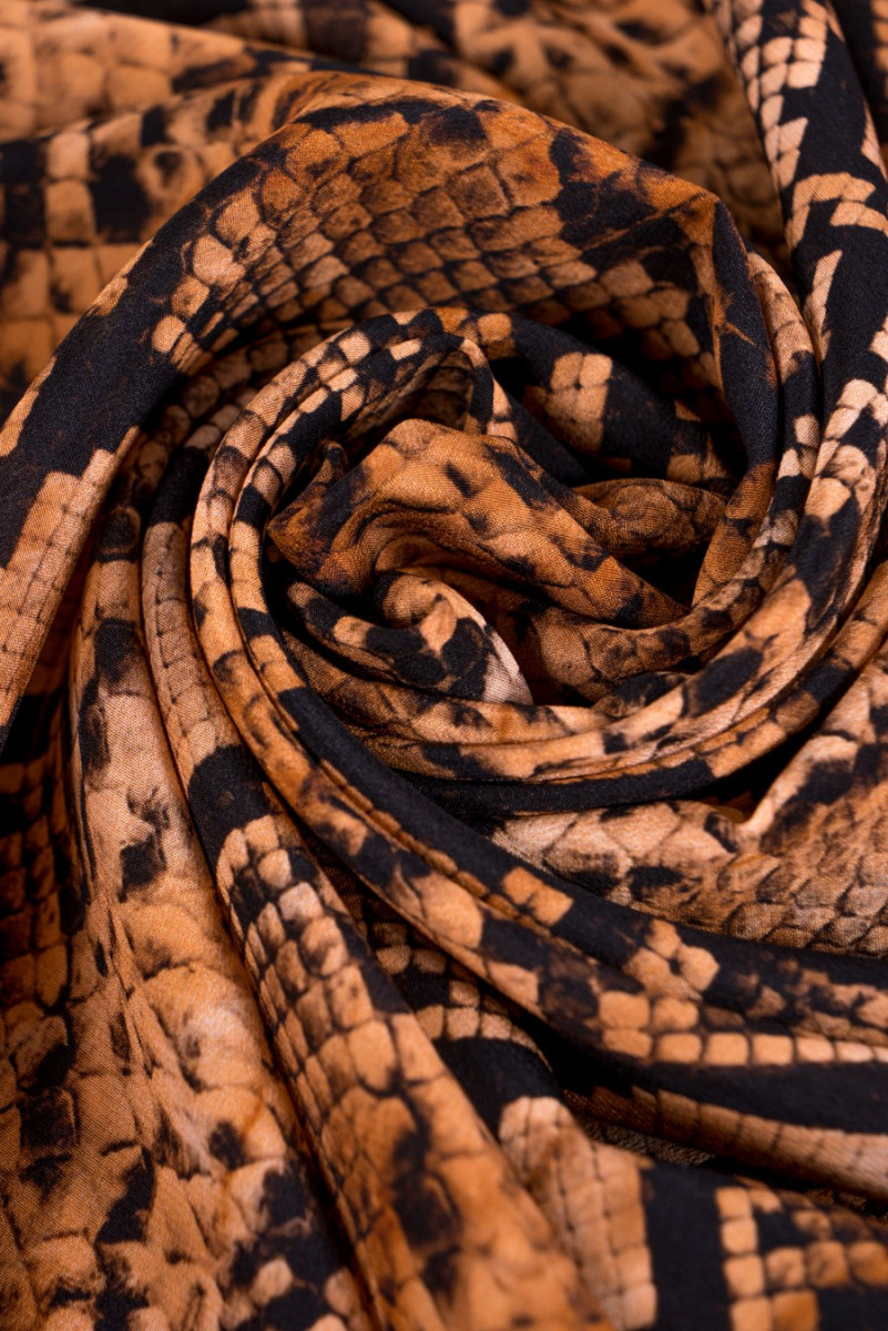 Італійський шовковий креп з мотивом зміїної шкіри в чорно-коричневому кольорах. Еластична, м'яка, легка тканина ідеально підходить для пошиття сорочки, сукні, блузки, спідниці, шалі.