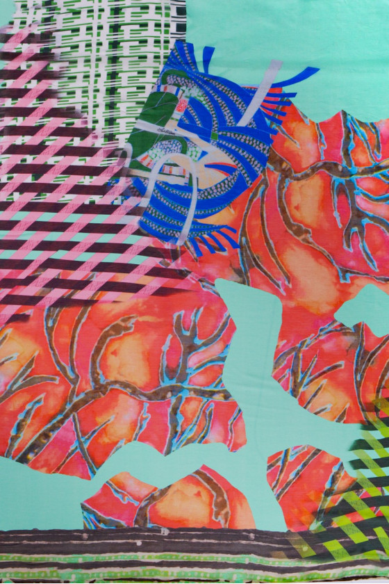Італійський шовковий шифон зім'ятий барвистим, химерним квітковим і геометричним мотивом. Тканина поставляється в купоні розмірами 105 см*135 см.