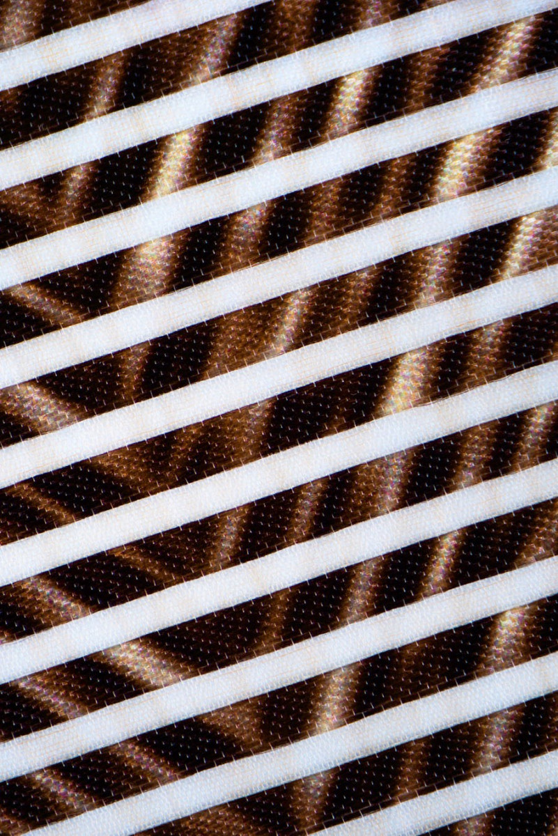 Італійська тканина органза з чергуються смугами - прозорою і непрозорою, шириною 0,5 см. Зигзагоподібний мотив в коричнево-бежевому кольорі. Прозорий пояс витканий з натурального шовку, а непрозорий - з поліестеру. Тонка, жорстка тканина - відмінно підійде для пошиття спідниці, сукні, блузки.