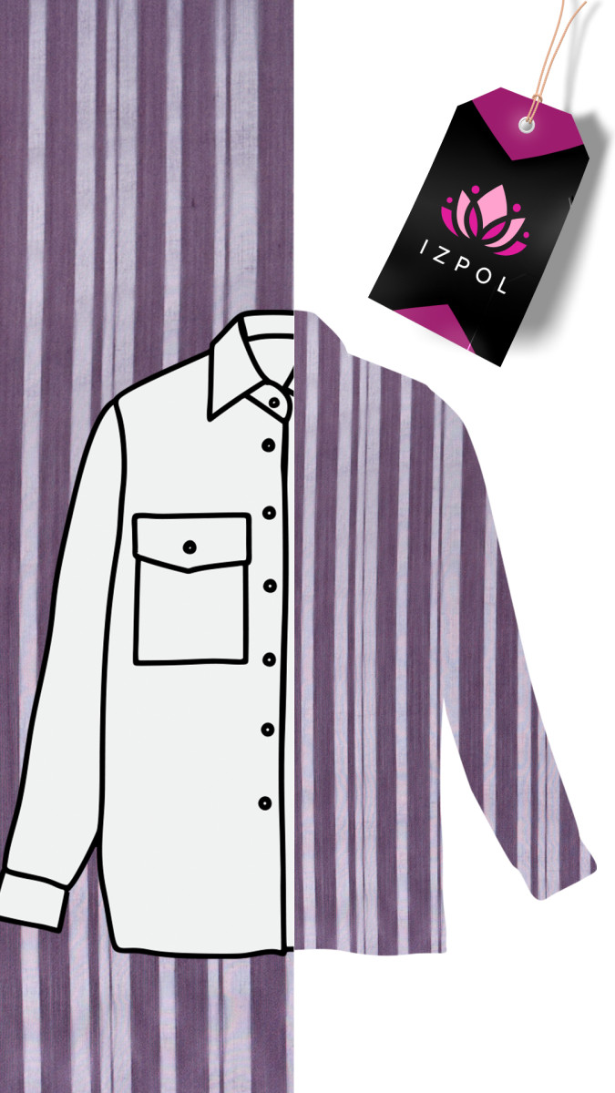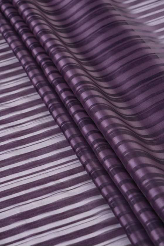 Італійська шовкова органза з приглушеним мотивом фіолетової смужки. Тонка, жорстка, прозора тканина - відмінно підійде для пошиття блузки, спідниці, сукні.