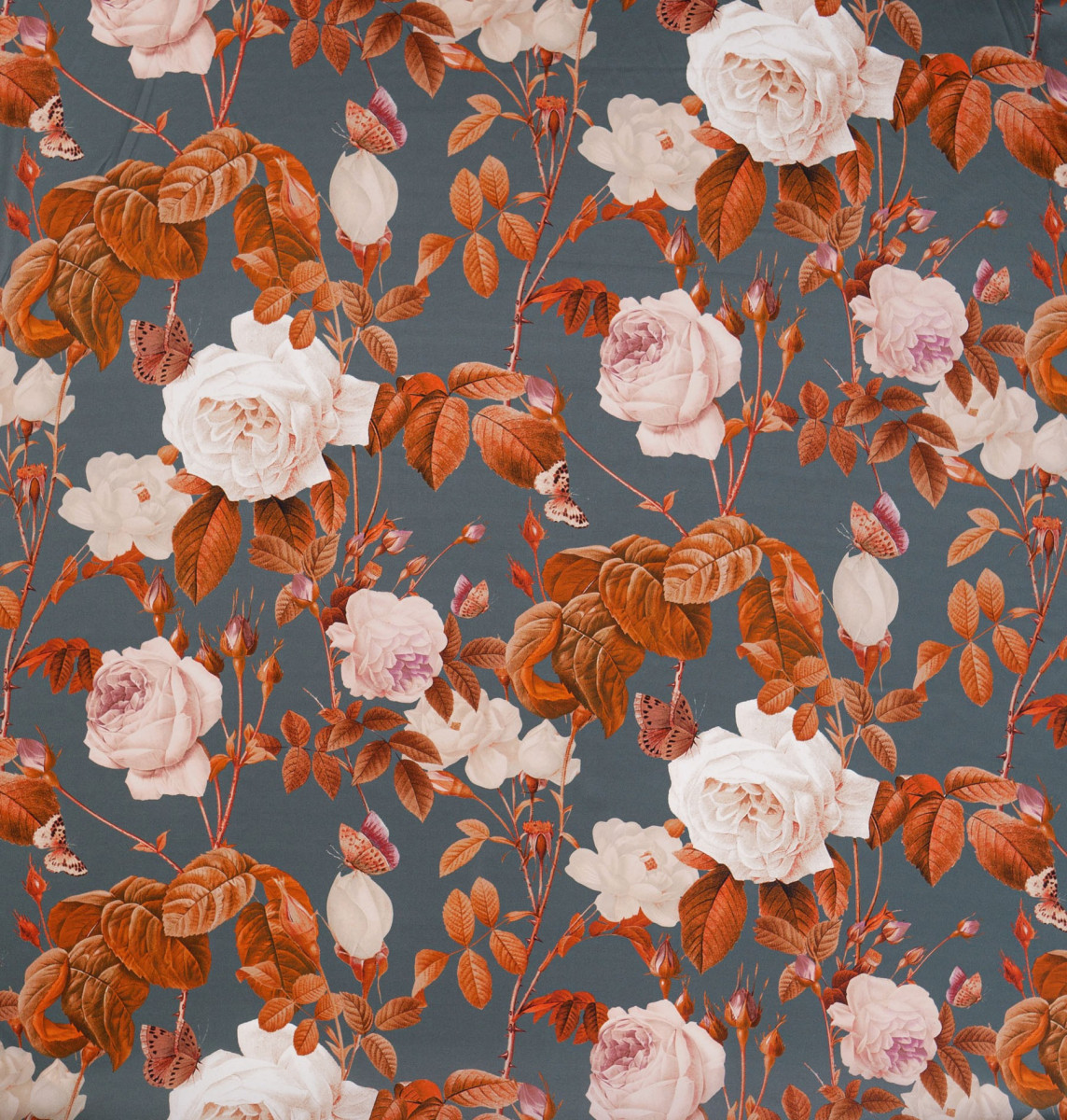 Італійський 100% шовковий креп сіро-зеленого кольору з мотивом великих, червоних квітів. Шовковий креп - ніжна, тонка, напівматова тканина.