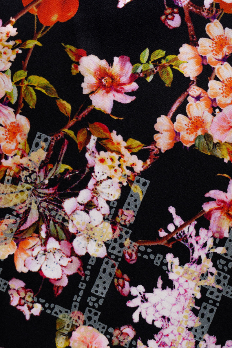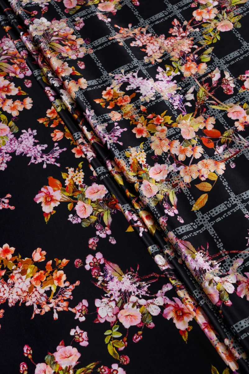 Італійський атлас зі 100% шовку в купоні розміром 185 см*140 см чорного кольору з квітковим мотивом, прикрашений сірою клітинкою внизу.