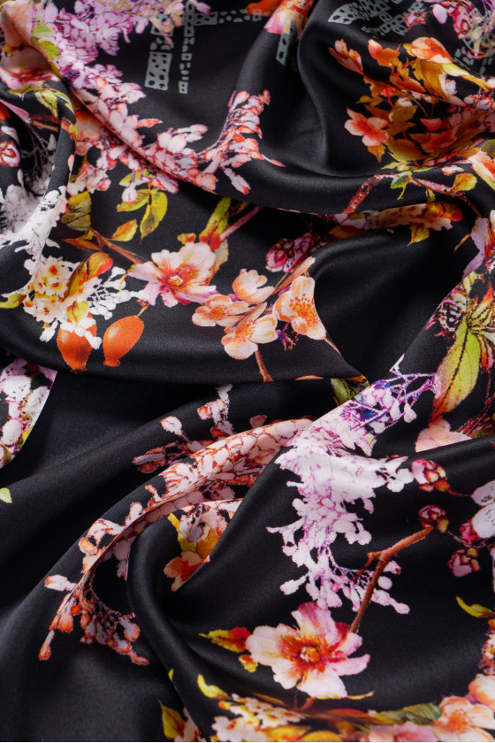 Італійський атлас зі 100% шовку в купоні розміром 185 см*140 см чорного кольору з квітковим мотивом, прикрашений сірою клітинкою внизу. Шовковий сатин - ніжна тканина, бархатиста на дотик, з легким блиском. З його допомогою можна чаклувати над повітряними сукнями, ніжними блузами, шарфами, хустками.