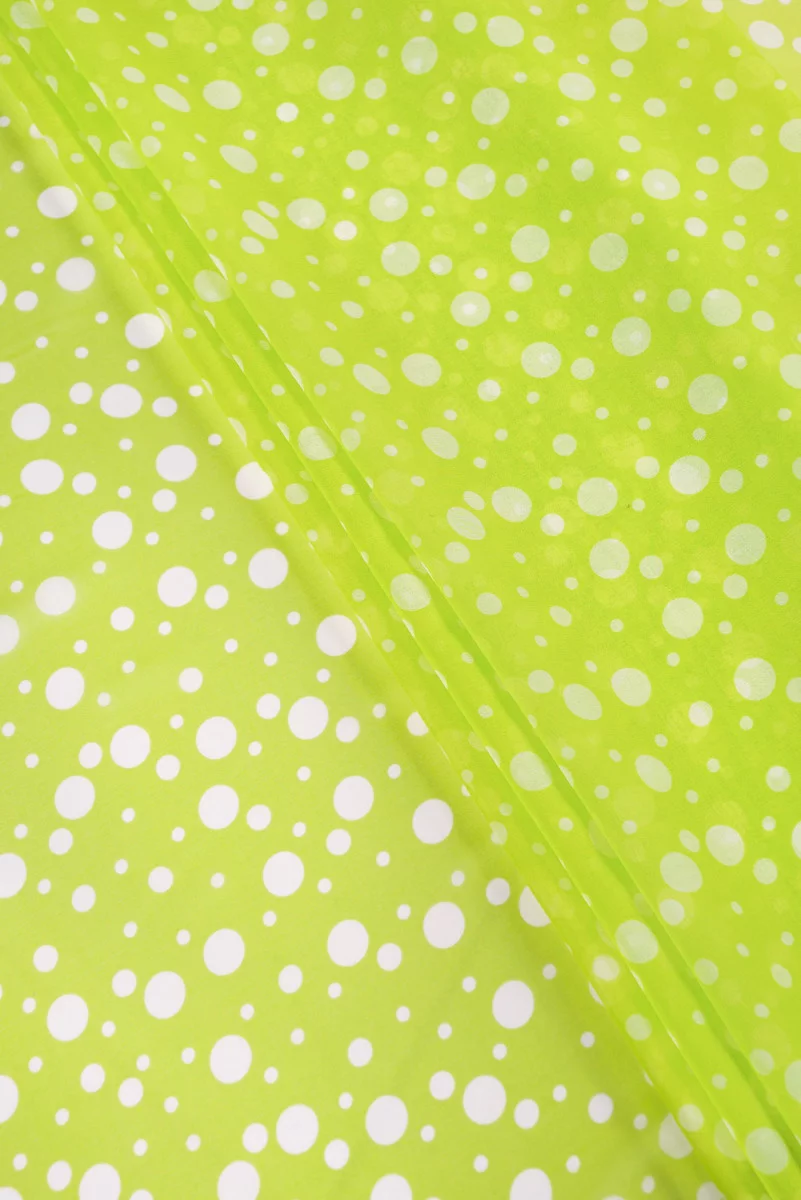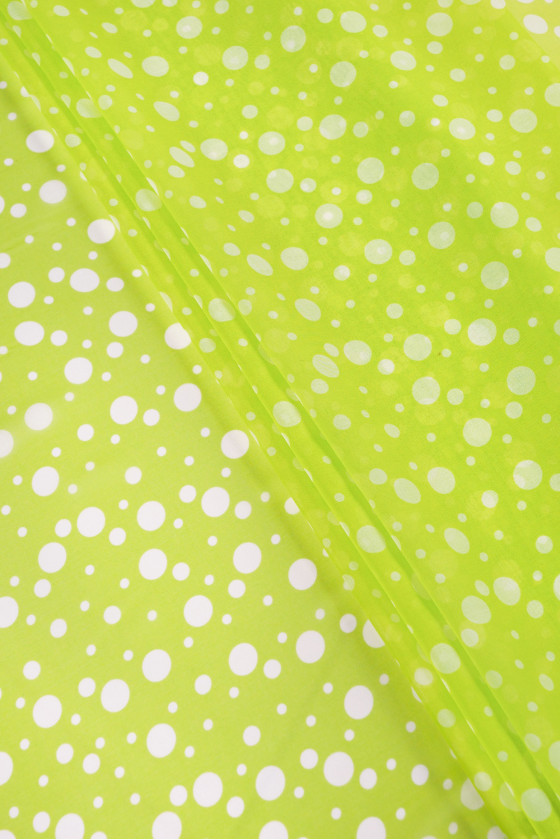 Італійський шифон 100% шовк пряно-зеленого кольору з мотивом білого, неправильного горошку. Шифон з натурального шовку - дуже ніжна, повітряна і прозора тканина. Ідеально підходить для повітряних суконь і блуз. Нееластична тканина.