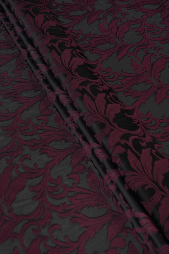 Італійська шовкова тканина з органзи чорного кольору з бордовим жакардовим візерунком листя. Органза з натурального шовку - це тонка, прозора, але жорстка тканина з ніжним блиском, характерним для шовкових тканин. Відмінно підійде для пошиття сукні, блузки, сорочки, спідниці.