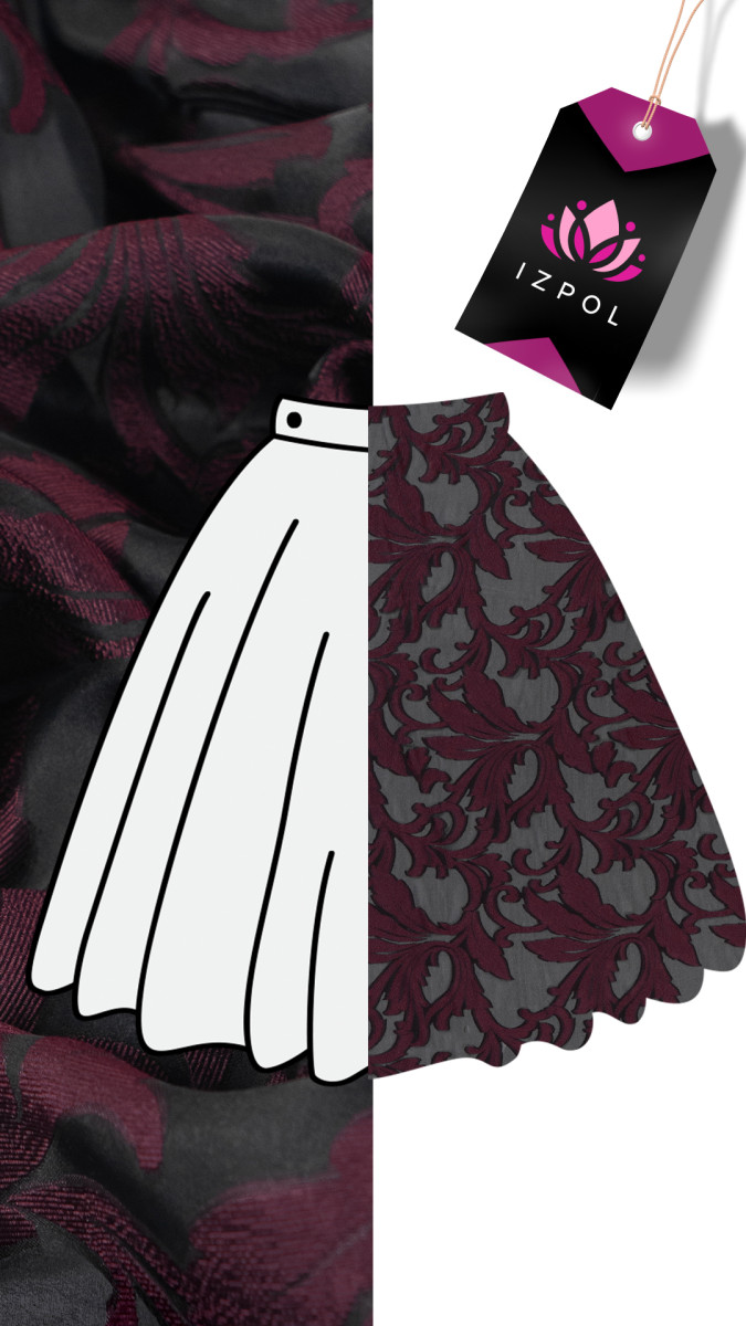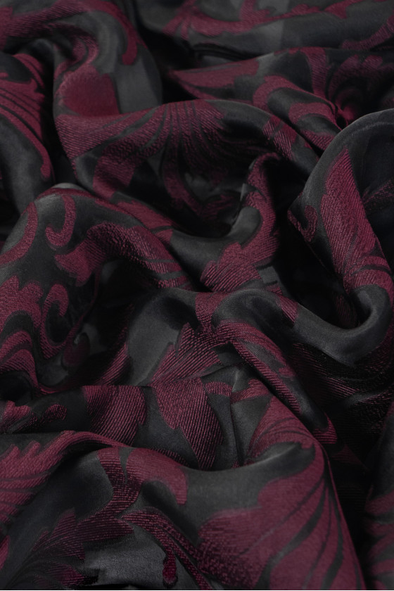 Італійська шовкова тканина з органзи чорного кольору з бордовим жакардовим візерунком листя. Органза з натурального шовку - це тонка, прозора, але жорстка тканина з ніжним блиском, характерним для шовкових тканин. Відмінно підійде для пошиття сукні, блузки, сорочки, спідниці.