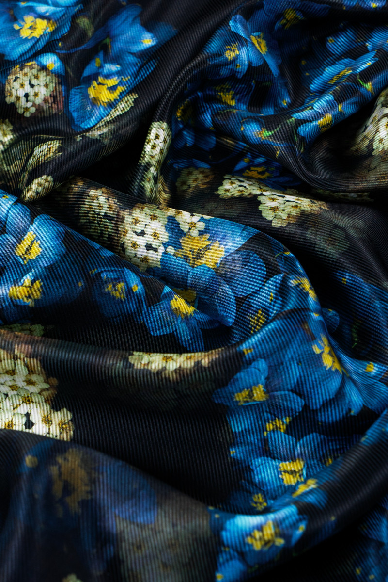 Італійська шовкова саржева тканина в купонах розміром 125см*140см. Тканина з великим квітковим мотивом кольору екрю і синього кольору на чорному тлі. Тканина м'яка, тонка, але непрозора, легка - відмінно підійде для пошиття сукні, спідниці або шалі.