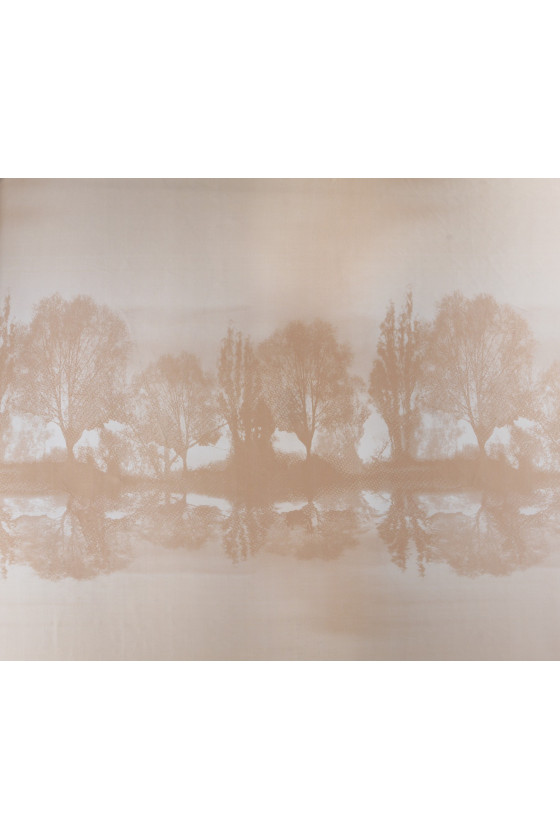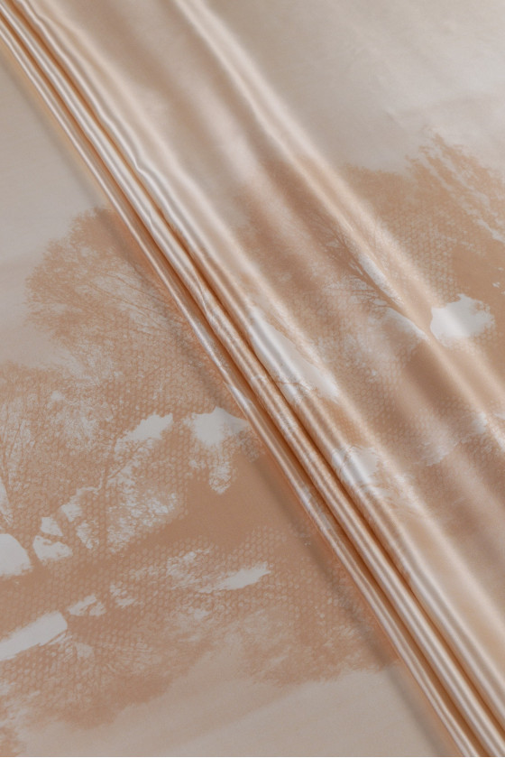 Італійський 100% шовковий атлас бежевого кольору з мотивом дерева (55 см) - візерунок окружний. Шовковий сатин - щільна і легка тканина з рівною поверхнею, виконана в атласному переплетенні. Додатковою перевагою є його плавність і довговічність, а також те, що він дуже добре лягає, не просвічується і приємний на дотик. З одного боку, він матовий, а з іншого - благородно блискучий. З його допомогою можна чаклувати над повітряними сукнями, ніжними блузами, спідницями, шарфами, хустками.