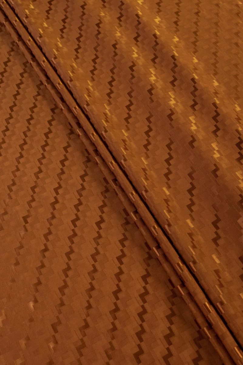 Італійська тканина 100% шовк червоного кольору, тканина жакардового переплетення з зигзагоподібним мотивом, розташованим по діагоналі. Нееластична тканина, тонка, але непрозора, легка з характерним для шовкових тканин блиском.