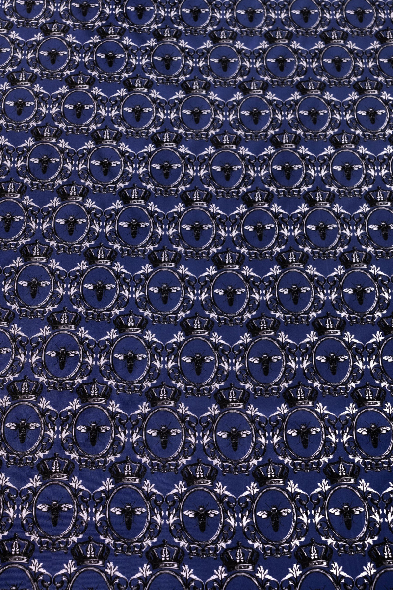 Італійська 100% шовкова саржева тканина темно-синього кольору з мотивом банта саржа в короні в білому і чорному кольорах (мотив розміром 8 см). Шовкова саржа - це тканина з саржевим переплетенням, м'яка, дуже міцна, ніжно жорстка за розміром. Ідеально підходить для пошиття сорочки, сукні, спідниці або хустки/шарфа.