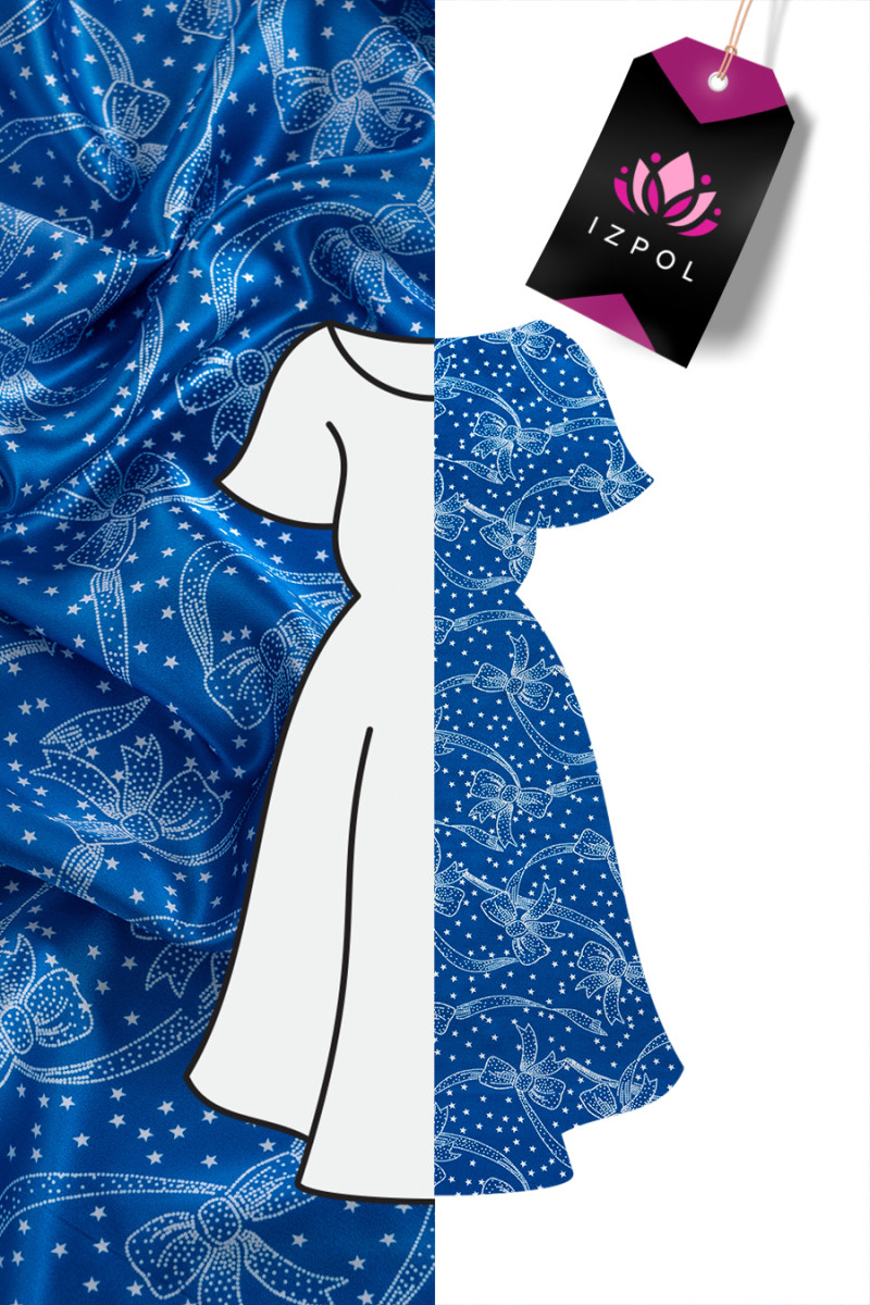 Італійський атлас зі 100% шовку синього кольору з мотивом сірих і білих бантів і маленьких зірочок. Шовковий сатин - щільна і легка тканина з рівною поверхнею, виконана в атласному переплетенні.