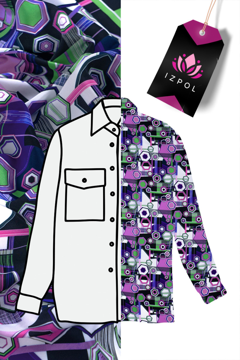 Італійський 100% шовковий атлас з геометричними візерунками 3 - 7 см в зеленому, фіолетовому і рожевому кольорах - принт виконаний на матовій стороні. Шовковий сатин - щільна і легка тканина з рівною поверхнею, виконана в атласному переплетенні. Додатковою перевагою є його плавність і довговічність, а також те, що він дуже добре лягає, не просвічується і приємний на дотик.
