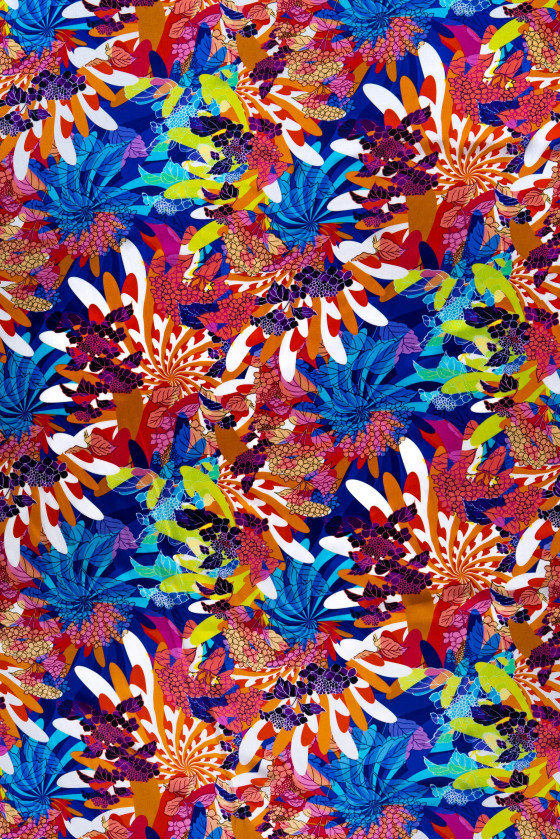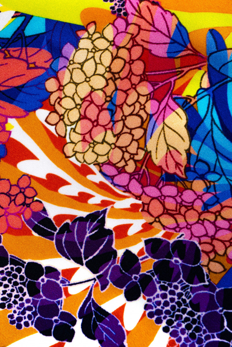 Італійський шовковий атлас, еластичний з мотивом квітів і листя в відтінках фіолетового, помаранчевого, волошкового і рожевого. Шовковий сатин - щільна і легка тканина з рівною поверхнею, виконана в атласному переплетенні. Додатковою перевагою є його плавність і довговічність, а також те, що він дуже добре лягає, не просвічується і приємний на дотик. З одного боку, він матовий, а з іншого - благородно блискучий. З його допомогою можна чаклувати над повітряними сукнями, ніжними блузами, спідницями, шарфами, хустками.