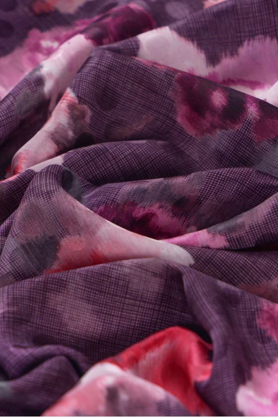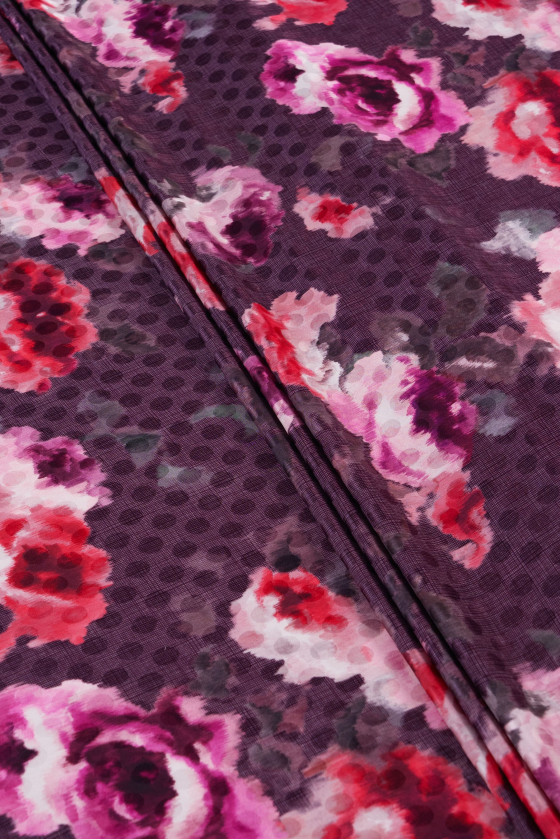 Італійський 100% шовковий креп з жакардовим переплетенням в атласний горошок, темно-фіолетова тканина з мотивом пофарбованих, різнокольорових квітів. Шовковий креп - ніжна, тонка, напівматова тканина. Вона м'яка на дотик і дуже добре сидить. З його допомогою можна чаклувати над повітряними сукнями, ніжними блузами, спідницями, шарфами, хустками.