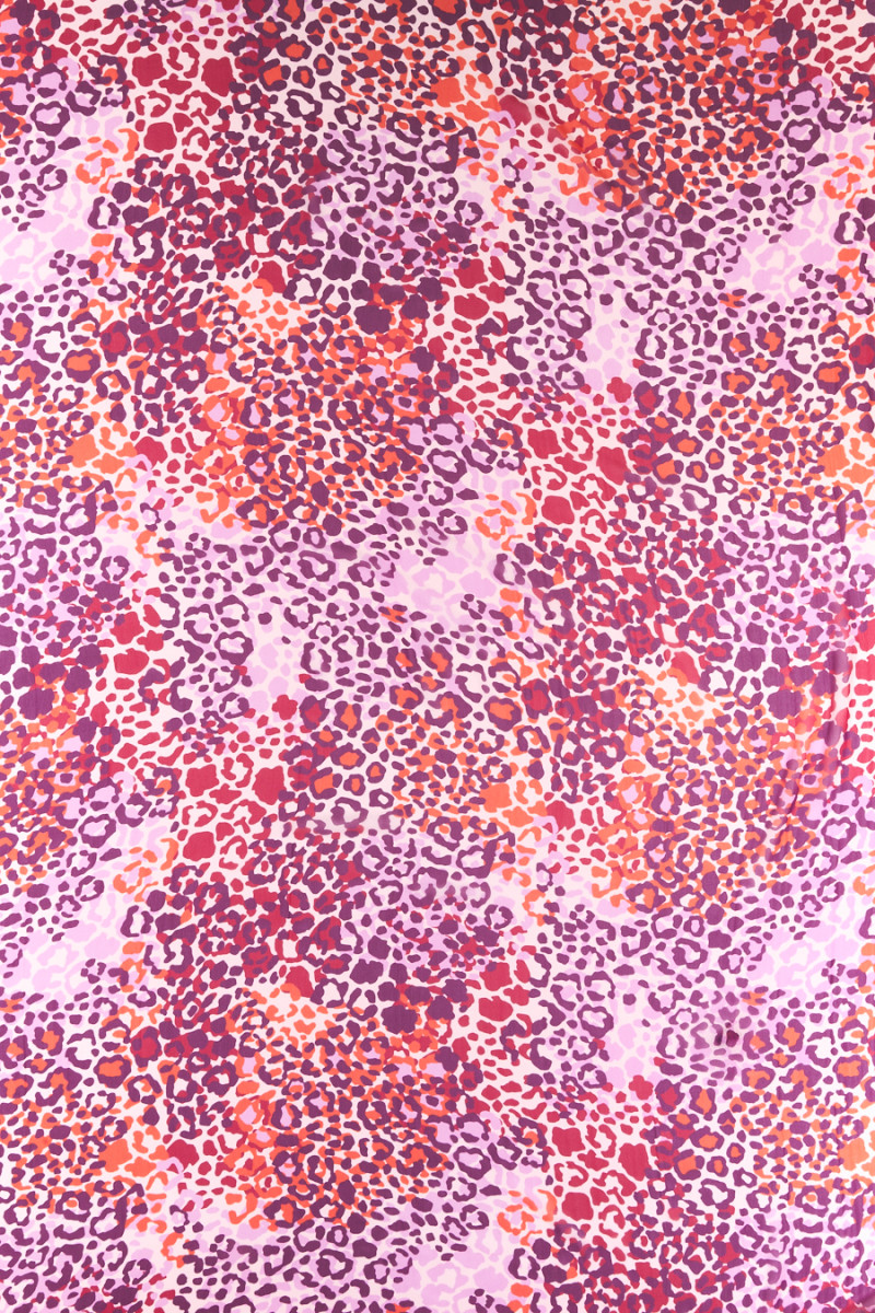 Італійський шифон 100% шовк світло-сірого кольору з червоно-фіолетовим леопардовим принтом з помаранчевими акцентами. Тканина тонка, прозора, матова, легка і повітряна.