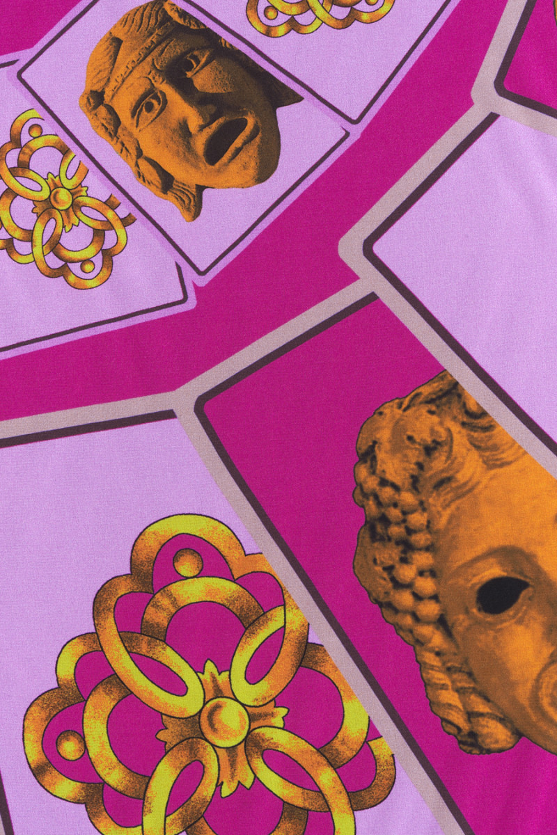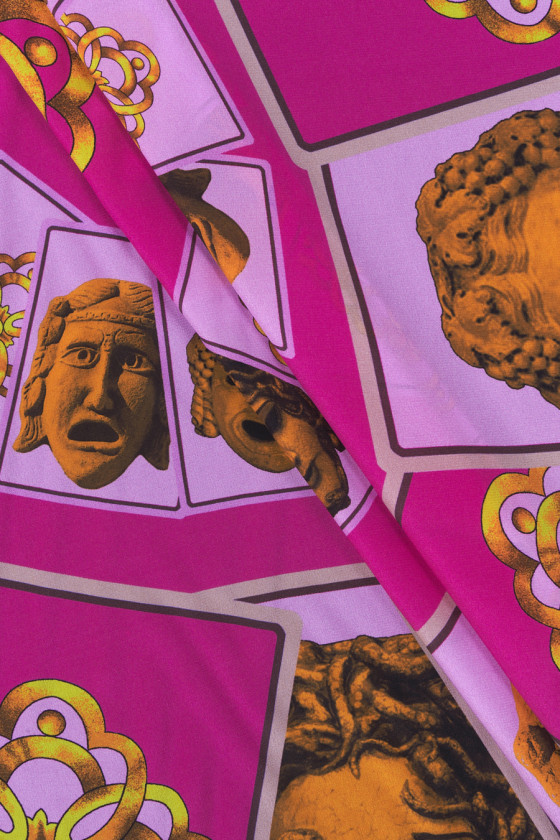 Італійський 100% шовковий креп в купоні розмірами 145 см*140 см з мотивом золотистих орнаментів і масок на фіолетово-фуксійному тлі. Шовковий креп - ніжна, тонка, напівматова тканина. Вона м'яка на дотик і дуже добре сидить. З його допомогою можна чаклувати над повітряними сукнями, ніжними блузами, спідницями, шарфами, хустками.