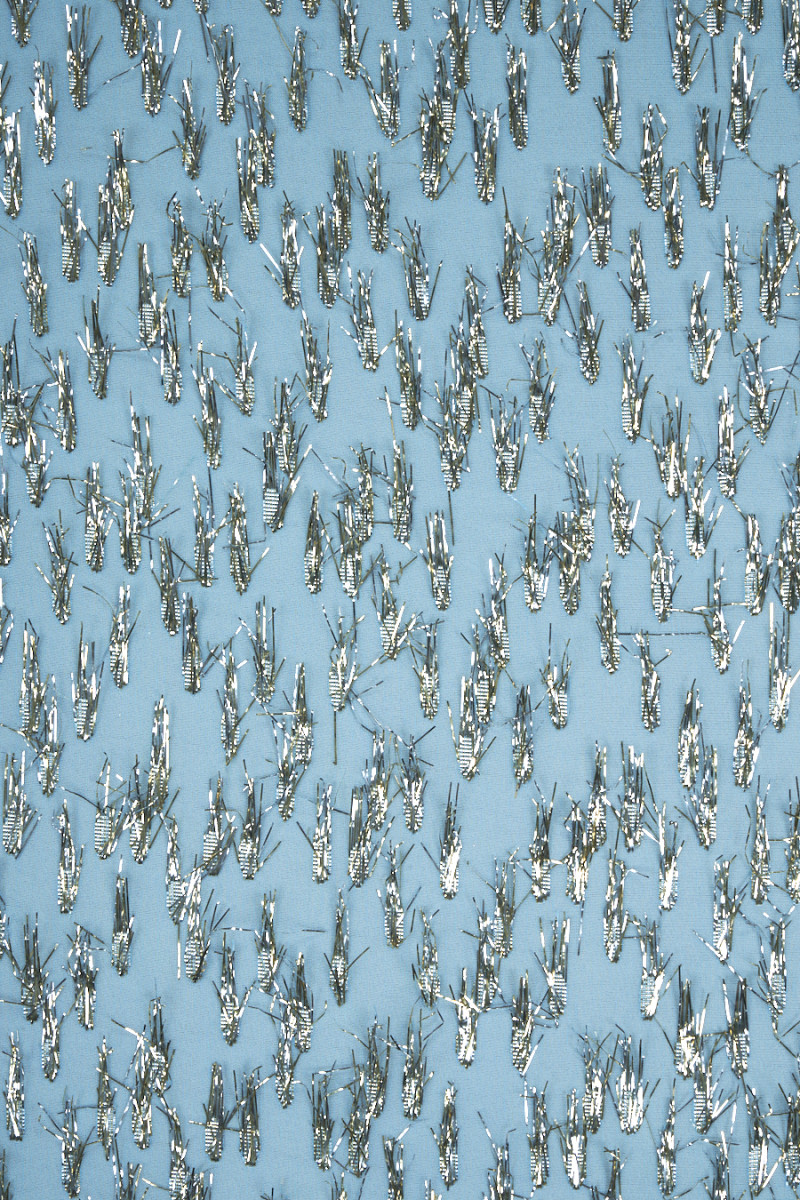 Італійський шовково-віскозний шифон синього кольору з мотивом золотистих китиць, довжиною 2 см, з люрексової нитки. Шифон - тонка, прозора, матова, легка і повітряна тканина.