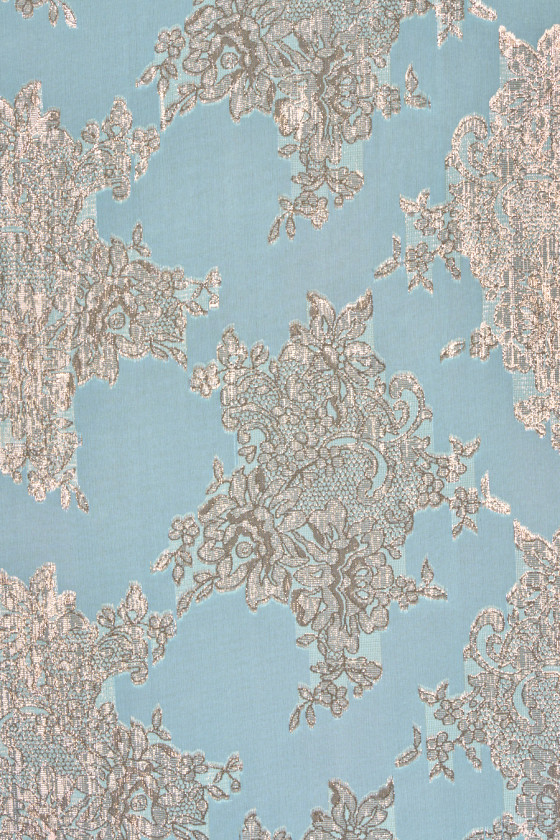 Італійський шифон 100% шовк синьо-бірюзового кольору з мотивом золотистих, жакардових квітів з люрексової нитки (близько 20 см). Шифон - тонка, прозора, матова, легка і повітряна тканина.