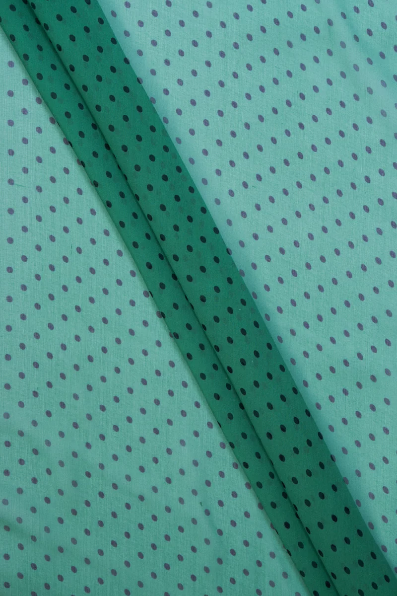 Італійський муслін 100% шовк зеленого кольору з густо розташованим чорним горошком діаметром 0,3 см. Прекрасна пропозиція для людей, яким подобаються позачасові візерунки в ніжних темних кольорах.