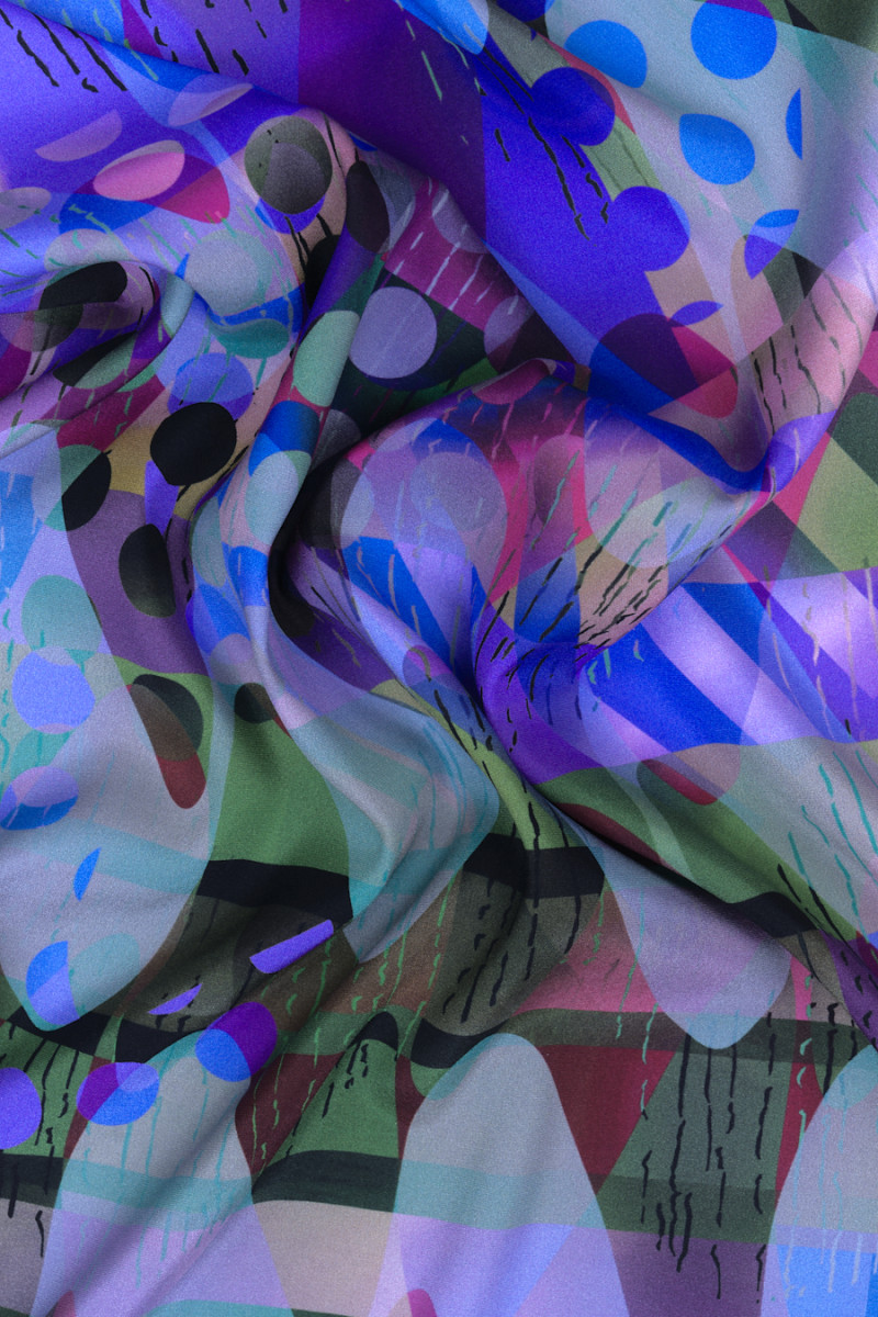 Італійський шовковий атлас, еластичний з «божевільним» геометричним мотивом. Непомітне поєднання різних візерунків та ін. точками, діагональними смугами і хвилями, створюється дуже цікавий «безлад». Вся витримана в чорному, волошковому, фіолетовому і зеленому кольорах - принт був виконаний на матовій стороні. Фантастична пропозиція для пошиття цікавої сорочки або сукні.