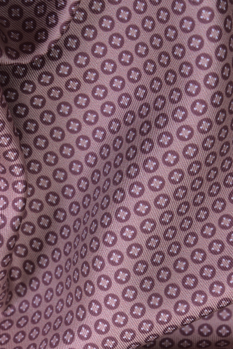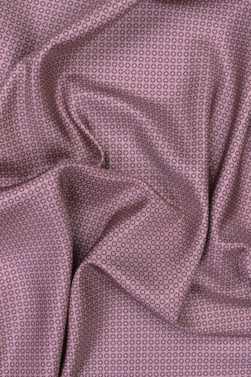 Італійська 100% шовкова саржева тканина брудно-рожевого кольору з дрібним малюнком. Дуже гарний, невеликий візерунок (0,4 см) бордового кольору з лососевою начинкою. За формою він нагадує горошок і дуже щільно розташований. Тканина тонка, але непрозора з ніжним саржевим переплетенням, ідеально підходить для пошиття сорочки, сукні або шарфа. Фантастична пропозиція для любителів дрібних візерунків у приглушених кольорах.