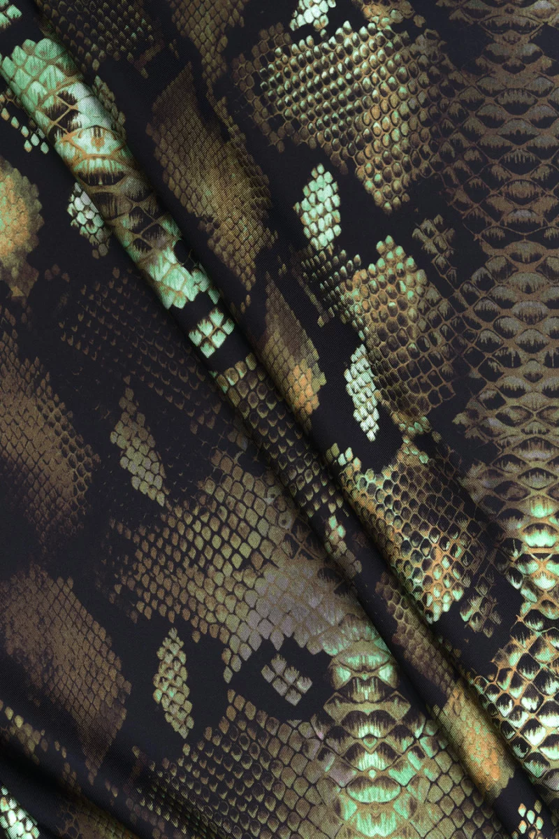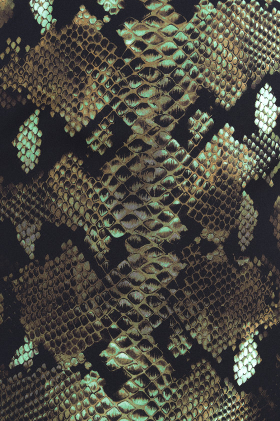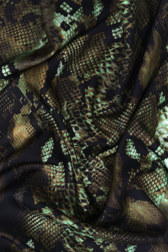 Італійська 100% шовкова саржева тканина з мотивом зміїної шкіри. Все витримується в бежевому, коричневому, чорному, оливковому і зеленому кольорах. Тканина тонка, але непрозора з ніжним саржевим переплетенням, ідеально підходить для пошиття сорочки, сукні або шарфа. Фантастична пропозиція для шанувальників тваринних візерунків у приглушених кольорах.